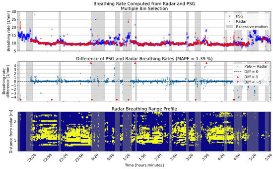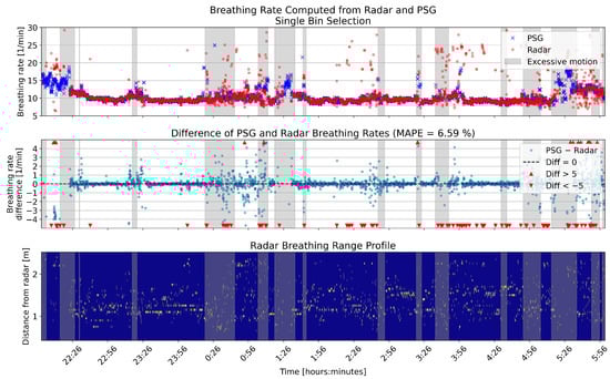 One example full night comparison of breathing rates computed from the PSG sensor and radar single bin selection. The upper panel shows the breathing rates in breaths per minute (BPM) for the two sensors. In the middle panel, the differences between the rates are shown in BPM. The lower panel shows the range profile, that is, the range bins that were selected for breathing rate computation (marked with yellow). Gray shading in each panel shows the segments that had high levels of motion based on the radar motion parameter.