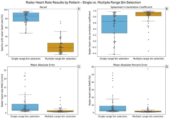 Box plots showing the distribution of per-patient radar heart rate performance metrics. The overlaid points each correspond to one patient. In each panel, the blue box on the left shows the single range bin selection results, while the orange box on the right shows the multiple range bin selection results. (A) shows the radar heart rate recall. (B) presents Spearman’s correlation coefficient. (C) shows the mean absolute error (MAE), and (D) shows the mean absolute percent error (MAPE) of the computed radar heart rates.
