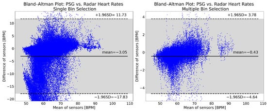 The Bland–Altman plots for the heart rates computed with single and multiple bin selection are shown in Figure 9. Multiple bin selection (right panel) has a mean of −0.43 BPM, while single bin selection (left panel) has a mean of −3.05 BPM. The single bin selection 95% confidence interval is more than three times as wide ([−17.83, 11.73] vs. [−4.64, 3.78]). For single bin selection, 7.26% of the points are below the lower limit of the confidence interval, and 0.24% are above the upper limit. For multiple bin selection, these values are 1.68% and 0.40%. Both approaches have an overall negative bias and show a similar trend: with an increasing heart rate, the radar goes from underestimating to overestimating the reference rate. However, the distribution of the plots is noticeably different, especially with single bin selection having more values underestimating the reference rate.