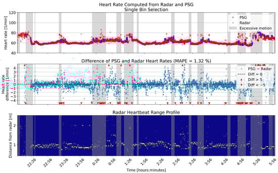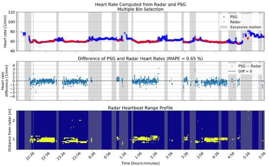 Figure 10 and Figure 11 show an example night of computed heart rates for the same patient, using single and multiple bin selection, respectively. The results shown are from the same patient as the breathing rate results in Figure 6 and Figure 7. The layout of the panels is the same as in those figures. Gray shading shows periods with high levels of motion based on the radar motion parameter. The negative bias pointed out in Figure 9 is visible with more negative difference values present in the middle panel of the two overnight figures.