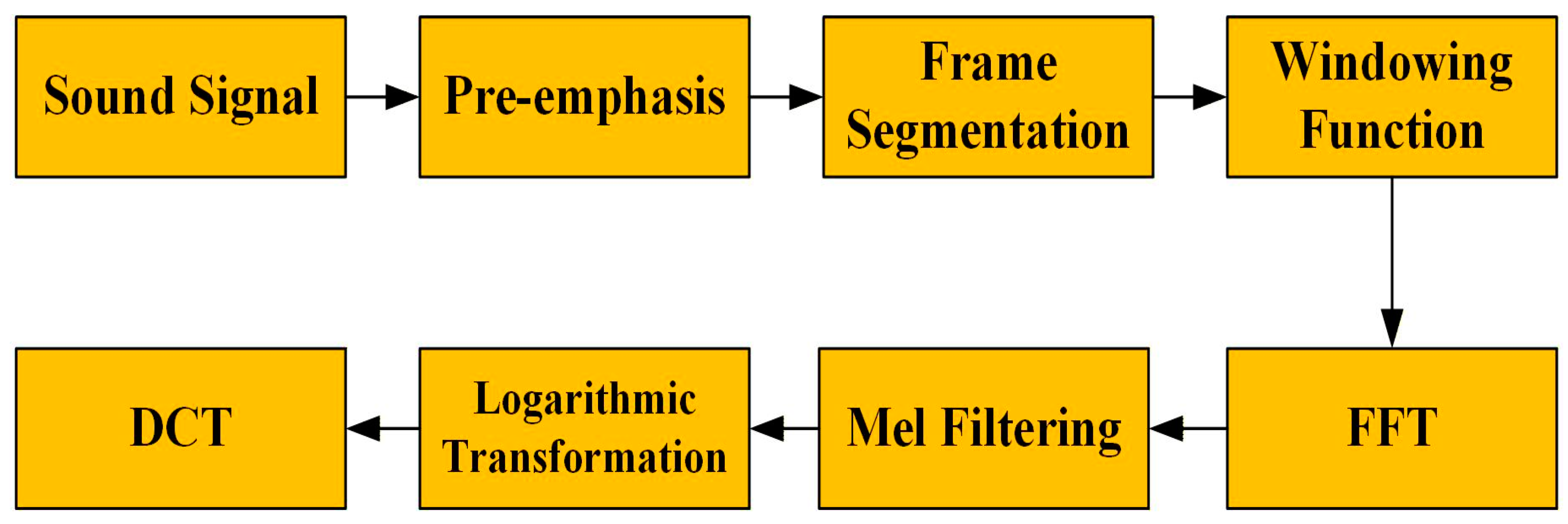 Compared with vibration signals, sound signals also have the capability to extract their acoustic features. The Mel frequency cepstral coefficient (MFCC) is a feature widely used in audio processing and speech recognition [38,39]. In this study, we have opted to extract the Mel frequency cepstral coefficients (MFCCs). The steps involved in extracting this feature are illustrated in Figure 2.