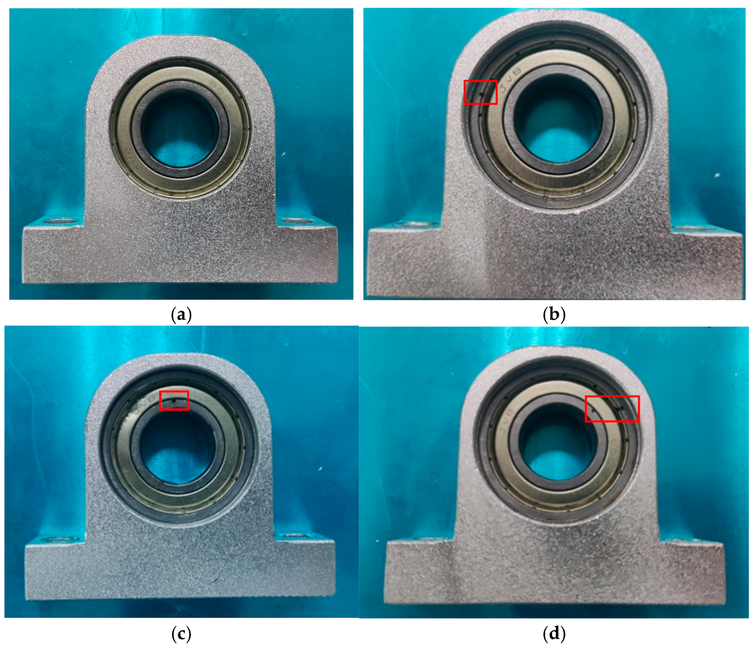 In this experiment, we collected sound signals of four groups of transmission systems: normal intact state bearing, the bearing of inner ring defect, the bearing of outer ring defect, and the bearing of mixed outer and inner defects. Sound signals were collected in a quiet laboratory environment, with sound signal collection times of 140 s.