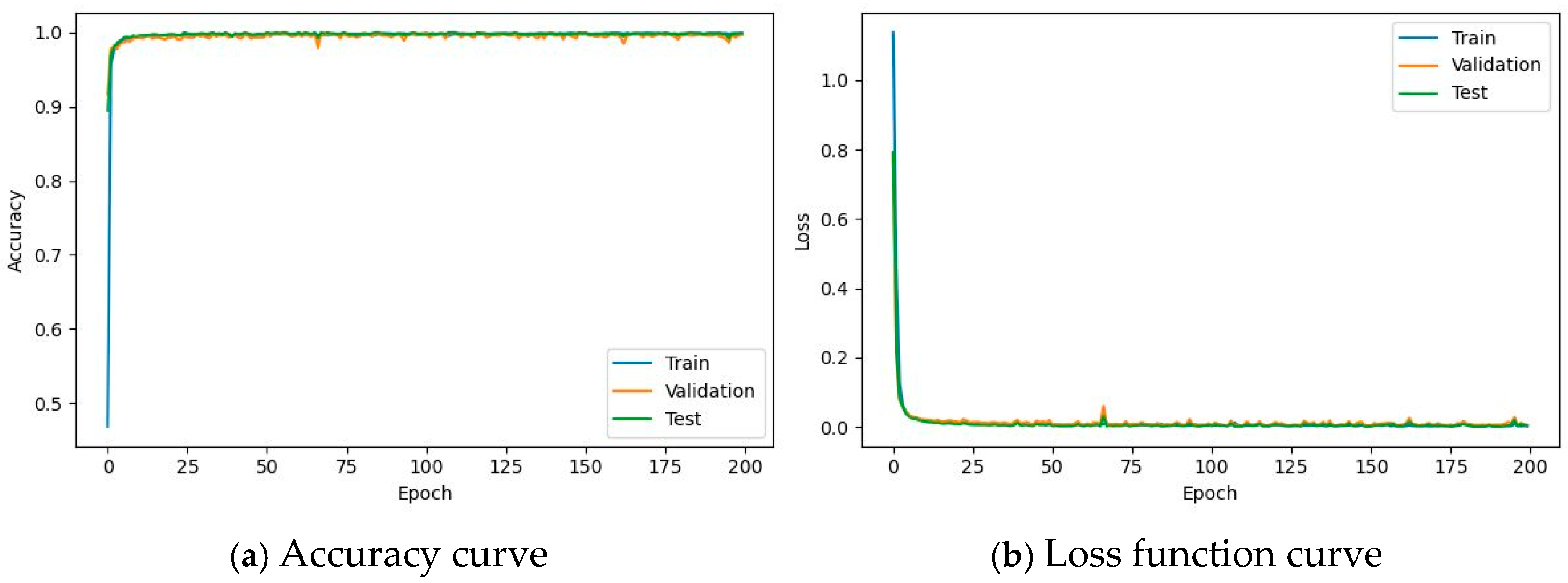 Through Section 3.1, the corresponding time domain, frequency domain, and acoustic features were extracted and compiled into the datasets essential for the experiment. Three datasets were created: one for time domain and frequency domain features, one for acoustic features, and one for combined complete features. The number of categories and features within each dataset is documented in Table 2, Table 3 and Table 4. In Table 2, Table 3 and Table 4, the numerical values under the columns “Number of 0”, “Number of 1”, “Number of 2”, and “Number of 3” indicate the sample count for each corresponding fault category (i.e., 1800 samples per category). The value in the “Number of Features” column represents the number of features in the dataset (i.e., 22, 39, and 61 features for the three datasets, respectively).These categories include 0 for the normal intact state bearing (nor), 1 for the bearing with outer ring defect (out), 2 for the bearing with inner ring defect (in), and 3 for the bearing with mixed inner and outer ring defects (all2).