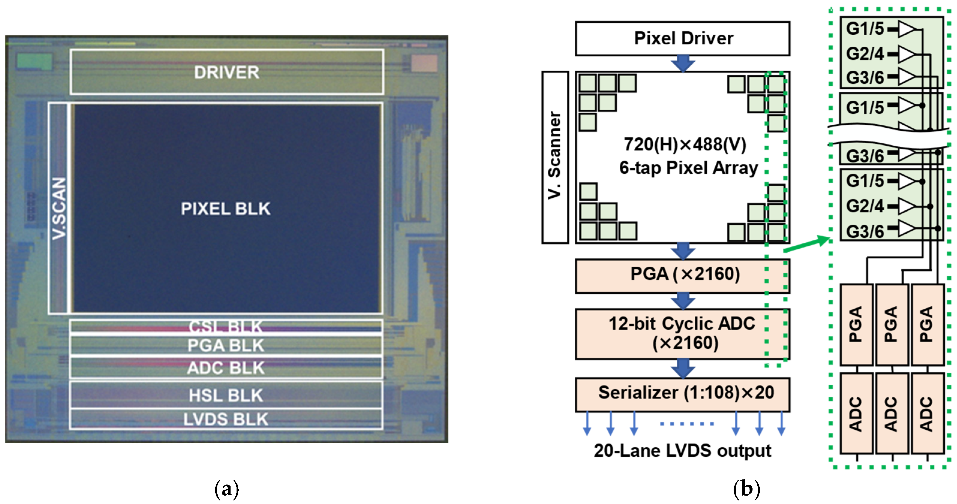 - Keel, M.-S.; Kim, D.; Kim, Y.; Bae, M.; Ki, M.; Chung, B.; Son, S.; Lee, H.; Jo, H.; Shin, S.-C.; et al. A 4-tap 3.5 μm 1.2 Mpixel Indirect Time-of-Flight CMOS Image Sensor with Peak Current Mitigation and Multi-User Interference Cancellation. In Proceedings of the 2021 IEEE International Solid-State Circuits Conference, San Francisco, CA, USA, 13–22 February 2021. [Google Scholar] [CrossRef]