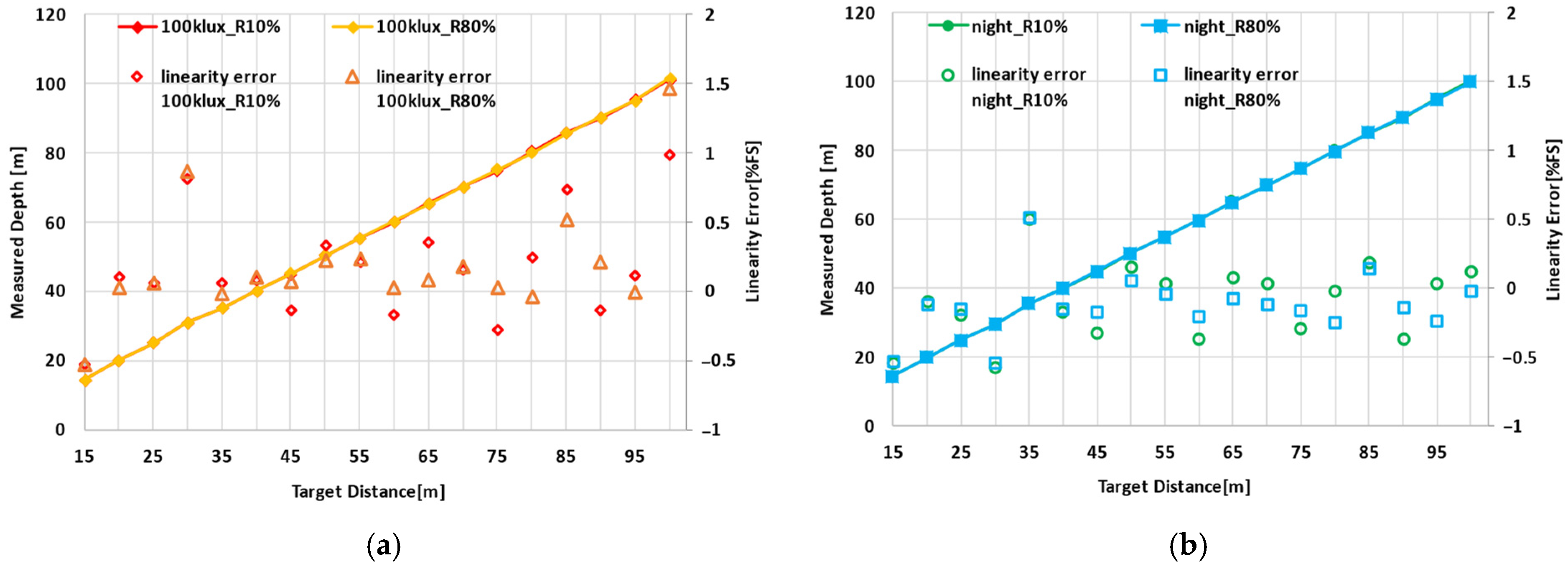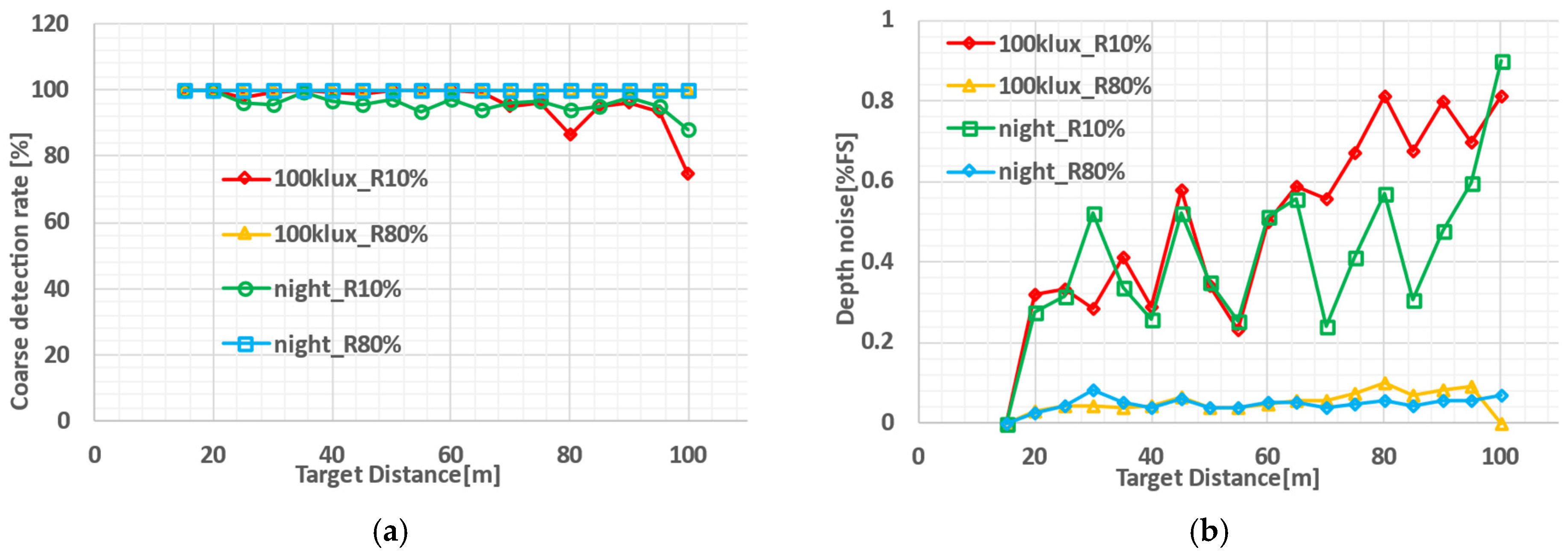 - Hatakeyama, K.; Okubo, Y.; Nakagome, T.; Makino, M.; Takashima, H.; Akutsu, T.; Sawamoto, T.; Nagase, M.; Noguchi, T.; Kawahito, S. A Hybrid ToF Image Sensor for Long-Range 3D Depth Measurement Under High Ambient Light Conditions. IEEE J. Solid State Circuits 2023, 58, 983–992. [Google Scholar] [CrossRef]