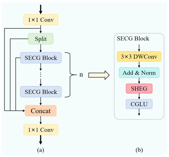 Figure 3. This module replaces the bottleneck layer in C2f with the designed SECG Block. By integrating deep convolutions, incorporating Single-head Self-attention (SHSA [