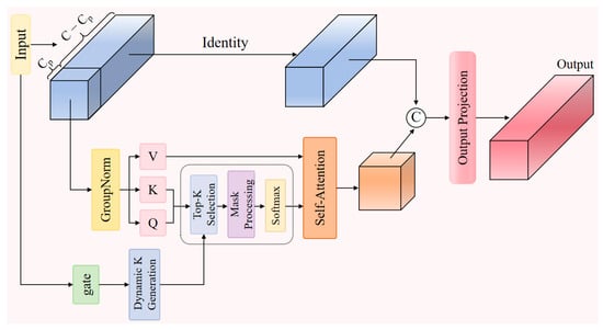 The gated network generates spatial weight maps through two 1 × 1 convolutional layers and the Sigmoid activation function . Here, represents the average of the gated output across the entire feature map, reflecting the importance level of the current feature. denotes the sequence length, while is the dynamically selected number of attention connections based on feature importance. This mechanism adaptively adjusts the attention scope based on local information density, focusing on greater detail in well-lit areas while concentrating on key contours in dim regions.