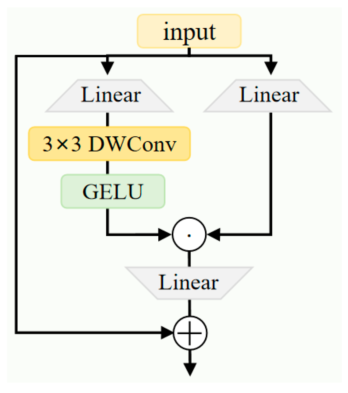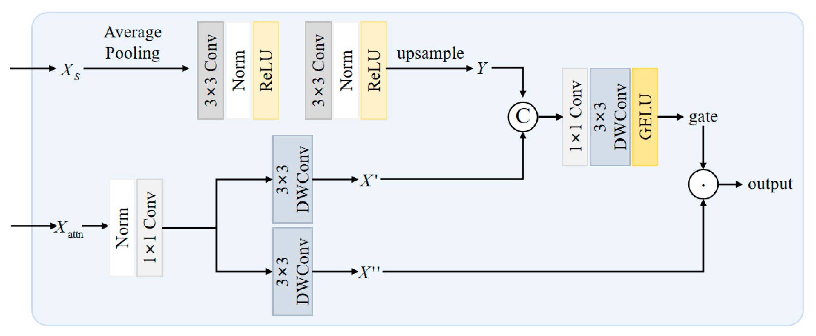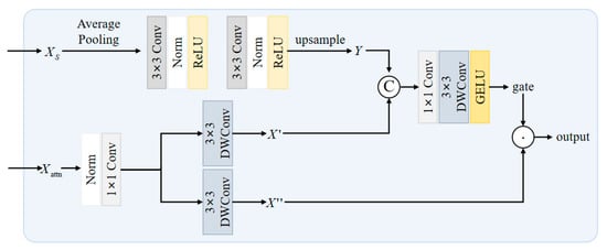 represents the value signal branch feature. The gate branch further extracts spatial features through a 3 × 3 depthwise convolution(DWConv) and employs the GELU activation function to enhance nonlinear expressive capability: