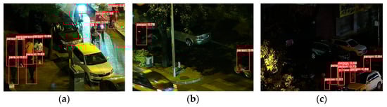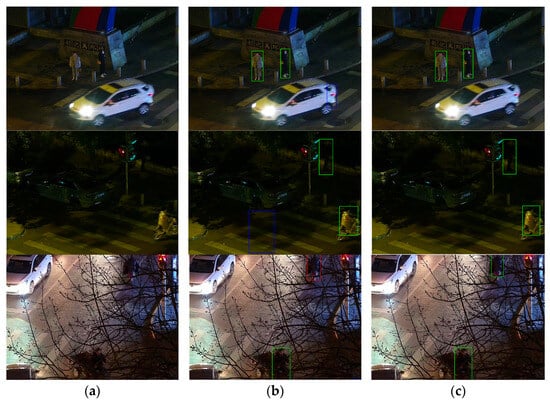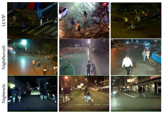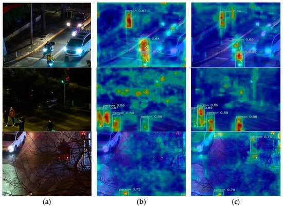 3]. However, when the scene shifts to low-light environments at night, visible light image quality deteriorates sharply. Prominent challenges arise, including uneven illumination, blurred object contours, significant background noise, and highly variable object scales, posing severe difficulties for pedestrian detection [