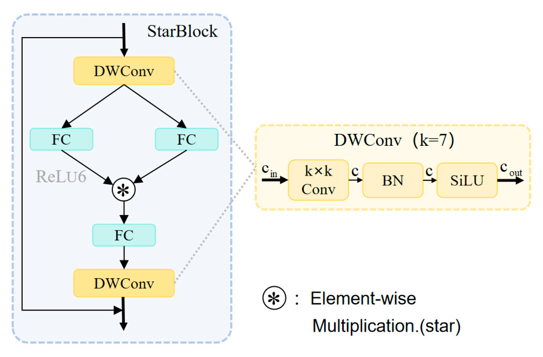 Firstly, Star Block combines two applications of large-core deep convolutions (7 × 7) to ensure a broad receptive field captures contextual relationships of blurred nighttime targets. Simultaneously, it integrates a stochastic depth mechanism as a regularization technique, enhancing generalization capabilities in scenes with variable lighting conditions: