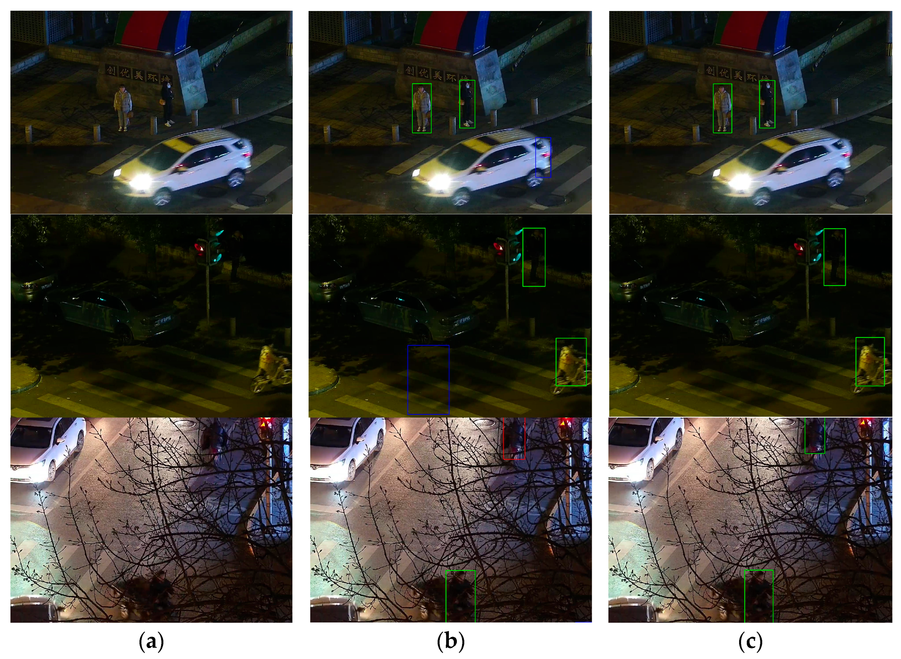 41], through structural simplification and quantisation optimization, successfully achieved efficient deployment in vehicle-to-everything (V2X) edge scenarios, further validating thermal imaging’s technical feasibility for nighttime tasks. However, thermal imaging solutions face insurmountable engineering bottlenecks: the hardware manufacturing costs of its core sensors far exceed those of visible-light cameras, and its adoption rate remains extremely low in consumer-grade terminals such as standard in-vehicle cameras and civilian surveillance equipment.