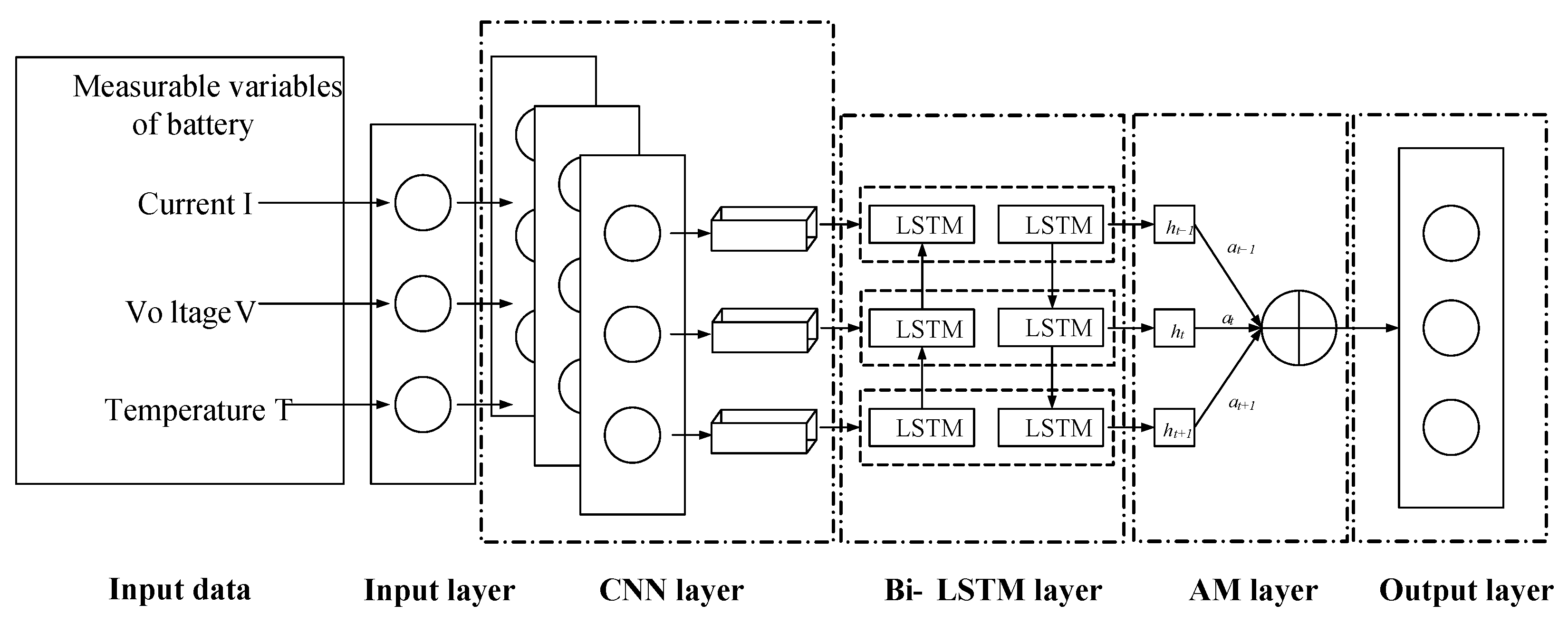 25. Yan, B.; Zheng, W.; Tang, D.; Li, Y.; Xing, Y. A knowledge-constrained CNN-BiLSTM model for lithium-ion batteries state-of-charge estimation. Microelectron. Reliab. 2023, 150, 115112. [Google Scholar] [CrossRef]
