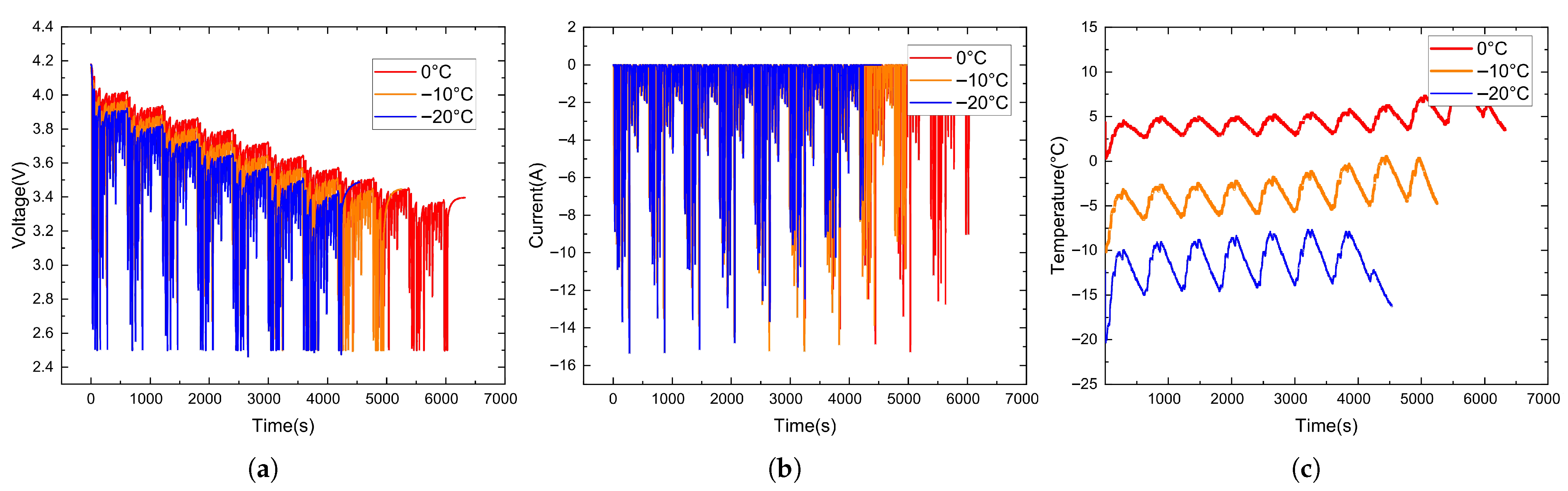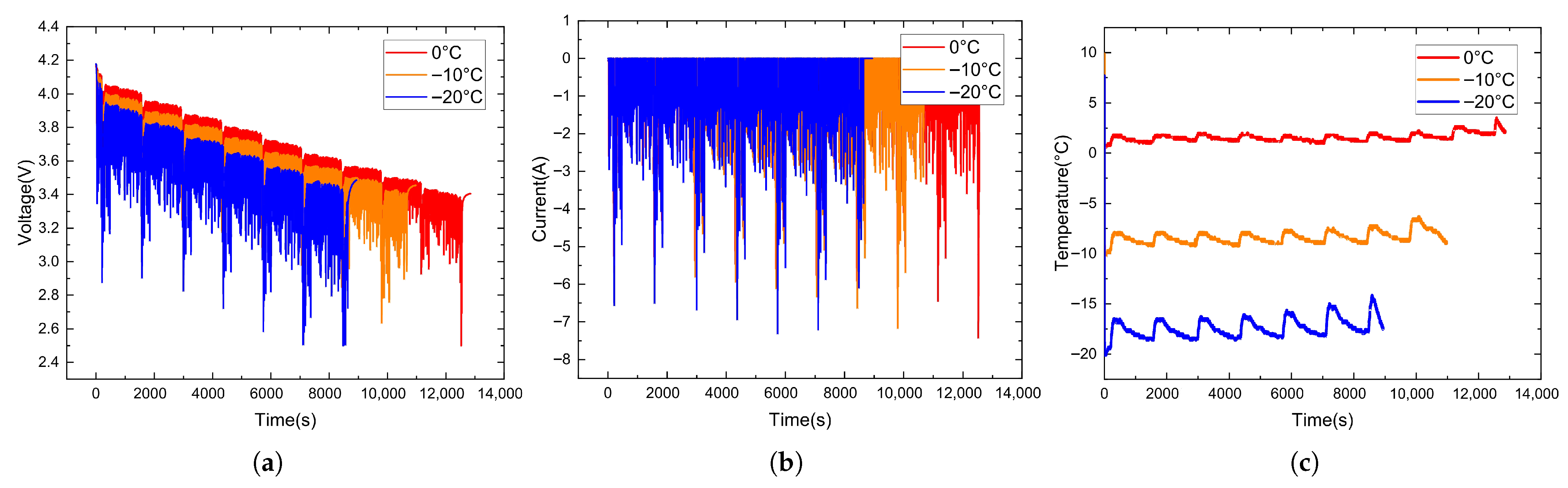 Figure 7. Data collected under the UDDS driving cycle. (a) Voltage variation curves. (b) Current variation curves. (c) Temperature variation curves.
