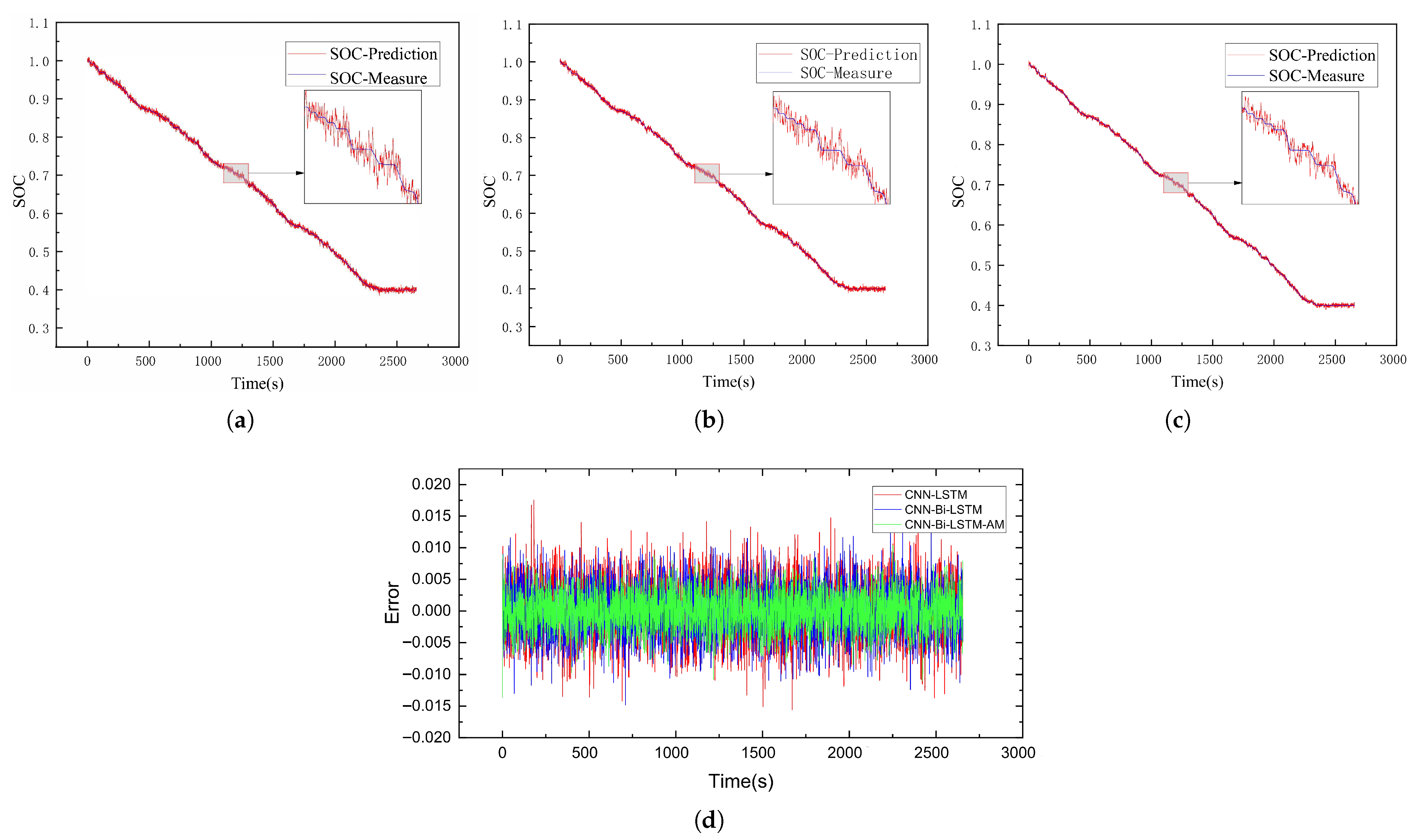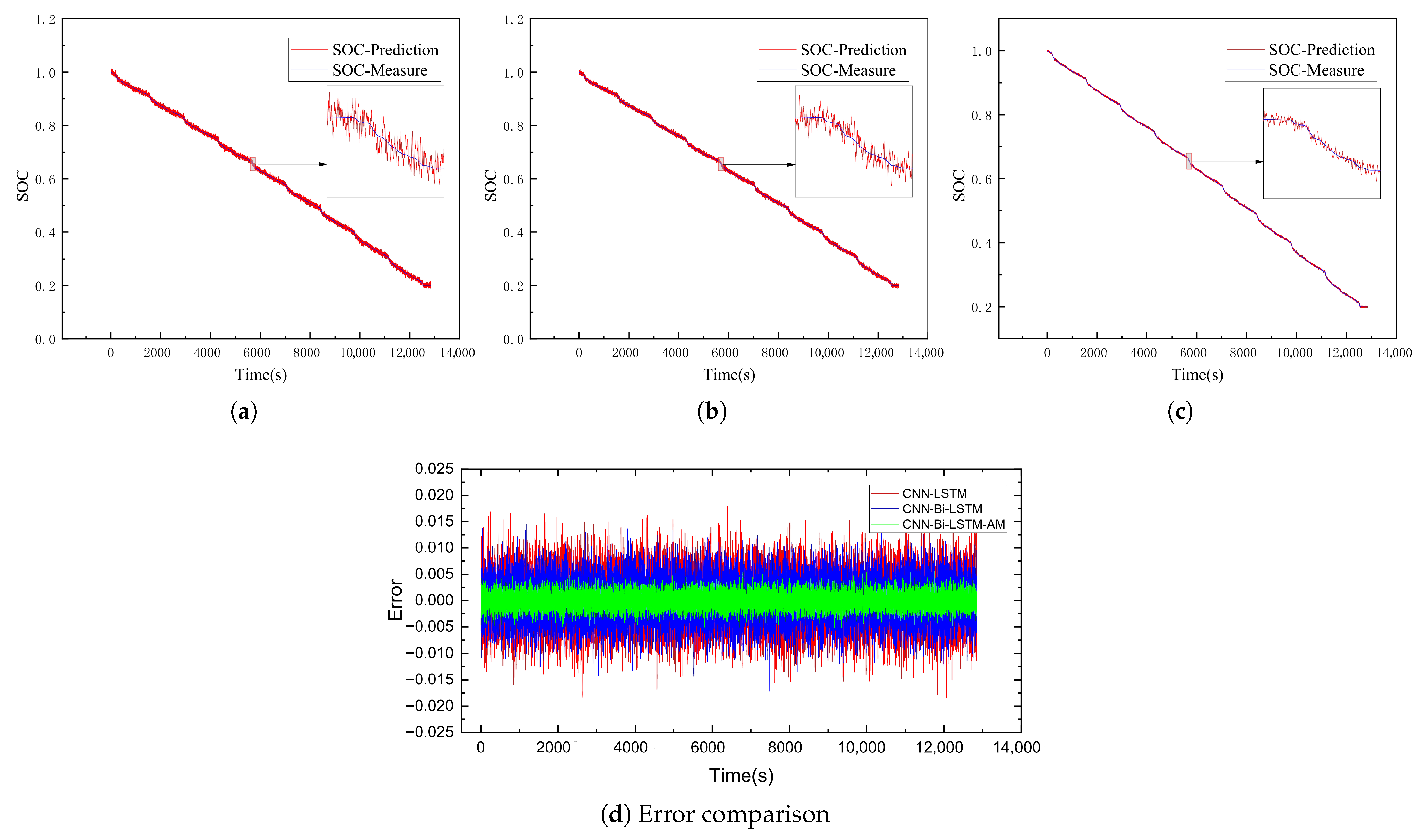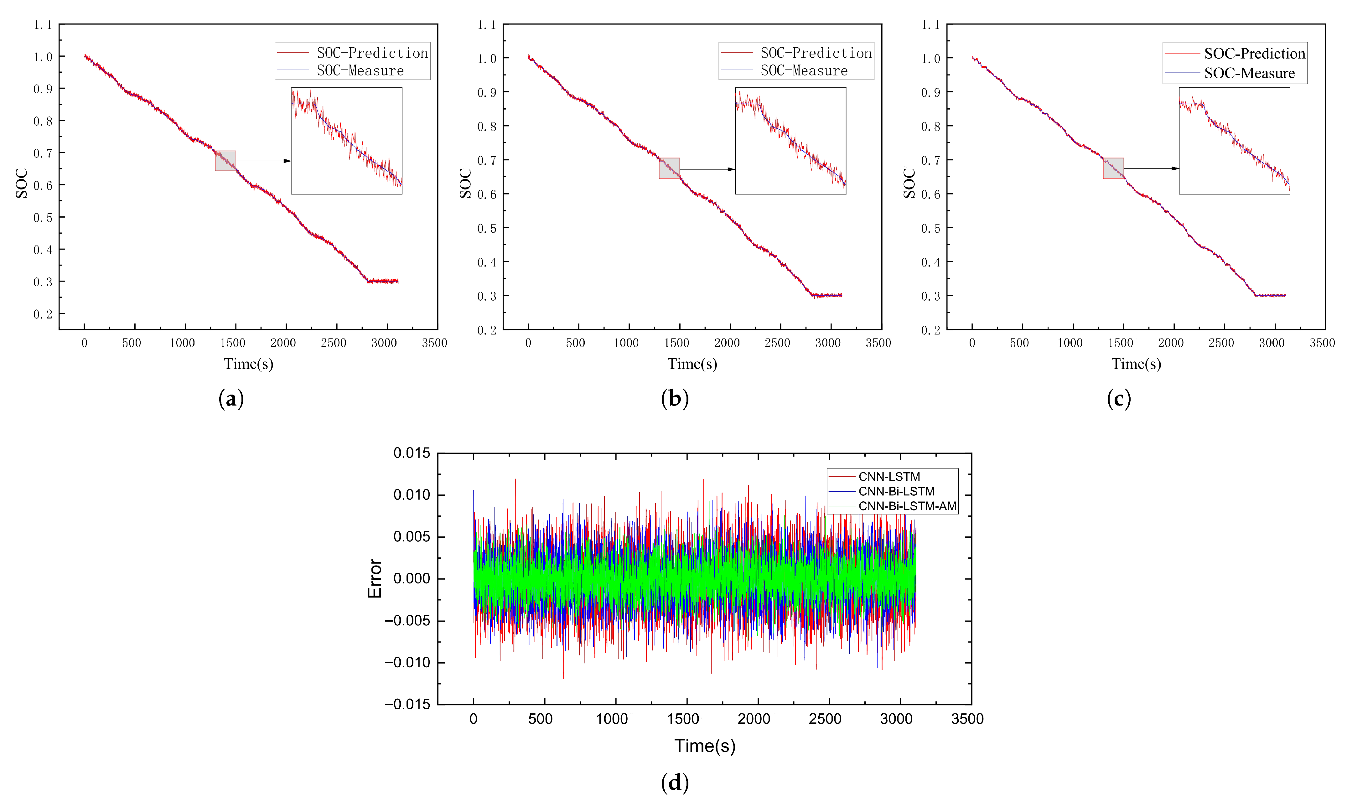 Figure 14. SOC prediction results of UDDS at 0 °C using different algorithms. (a) CNN-LSTM. (b) CNN-Bi-LSTM. (c) CNN-Bi-LSTM-AM. (d) Error comparison.