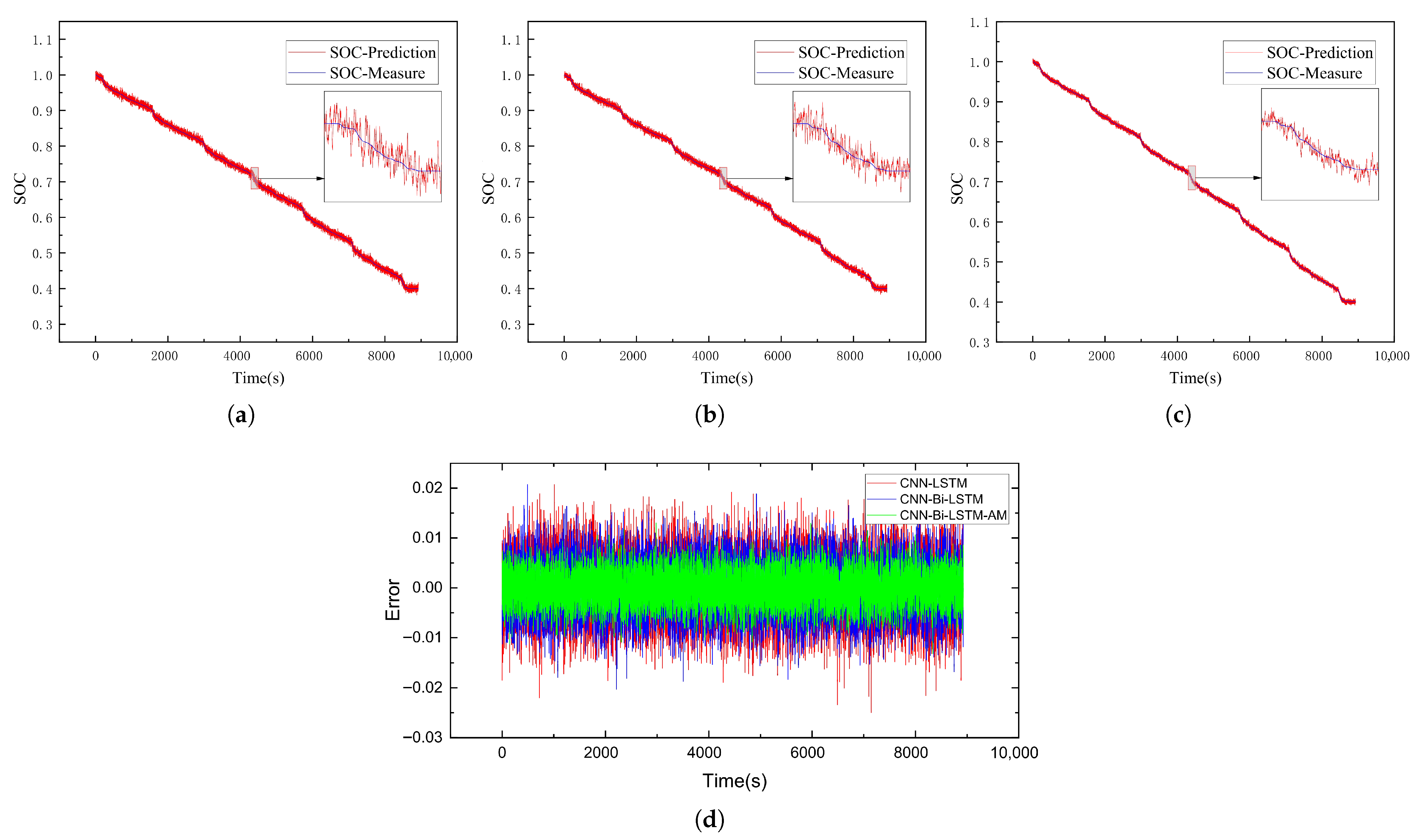 Figure 11. SOC prediction results of US06 at −10 °C using different algorithms. (a) CNN-LSTM. (b) CNN-Bi-LSTM. (c) CNN-Bi-LSTM-AM. (d) Error comparison.
