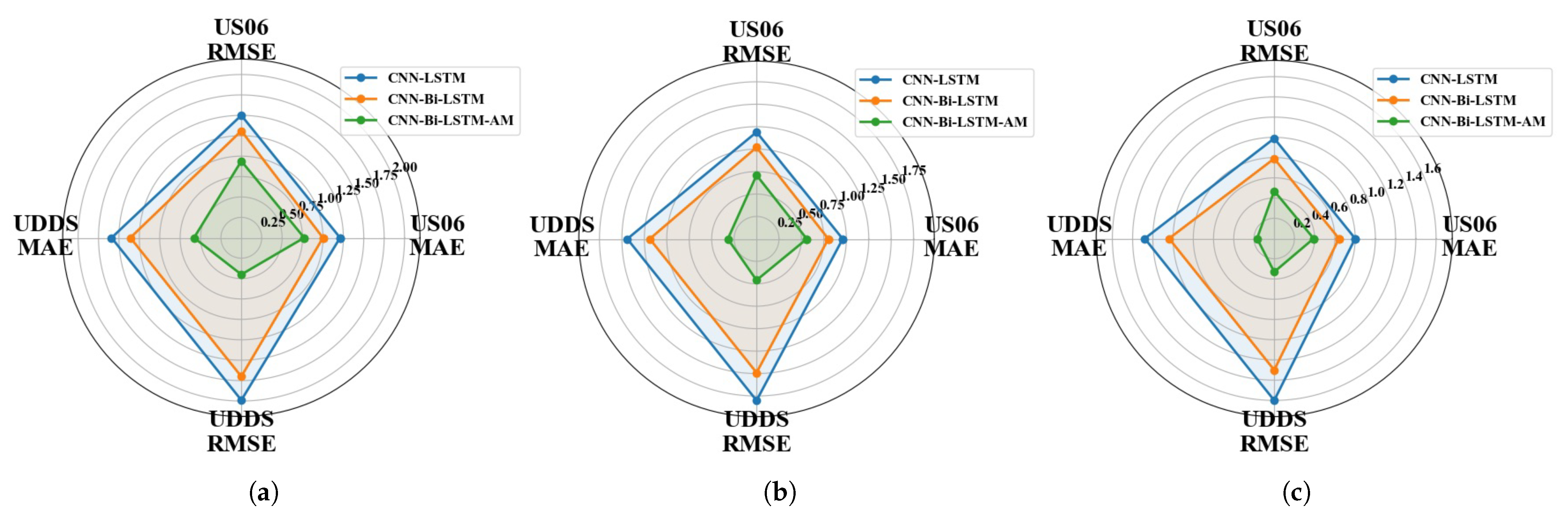 Hybrid-structure models typically achieve better results in complex tasks [35]. Compared with the CNN-LSTM and CNN-Bi-LSTM benchmarks, the proposed CNN-Bi-LSTM-AM model demonstrates significant advantages in estimation accuracy under low-temperature conditions. Across all tested temperatures and driving cycles, CNN-Bi-LSTM-AM consistently achieves the lowest MAE and RMSE. The improvement is primarily attributed to the incorporation of the AM, which enables the model to dynamically focus on the most informative time steps while suppressing noise and distortion prevalent in cold-environment operation.