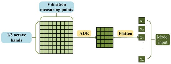 Based on the aforementioned advantages, this paper uses Adaptive Differential Evolution (ADE) to select the vibration feature subset with strong correlation to the target frequency band noise, and the fitness value is defined as the prediction error during neural network training. The specific process is illustrated in Figure 2: each row of the original input data represents the acceleration level of each structural vibration measurement point under a specific frequency band. The ADE algorithm implements a two-dimensional screening of vibration measurement points and 1/3 octave bands, and the resulting highly correlated features are flattened into a single row as the fully connected input for the subsequent neural network.