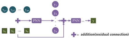 To further enhance nonlinear representation ability, this paper proposes a multi-stage cascaded PNN architecture via residual connection—PNN-ResNet. As network depth increases, the model may encounter gradient vanishing problem, leading to unstable training and optimization difficulties. To mitigate this issue, a residual connection mechanism is introduced to directly propagate features from previous stages to subsequent layers. The input features selected by ADE are added to the output of the first parallel neural network PNN module to serve as the input for the next parallel module. This process is repeated sequentially. By enabling direct information flow through skip connections, the residual structure alleviates gradient decay in deep networks, stabilizes training, and enables feature reuse, further enhancing expression efficiency and generalization performance. The final output is the noise value for the target frequency band, as shown in Figure 7.
