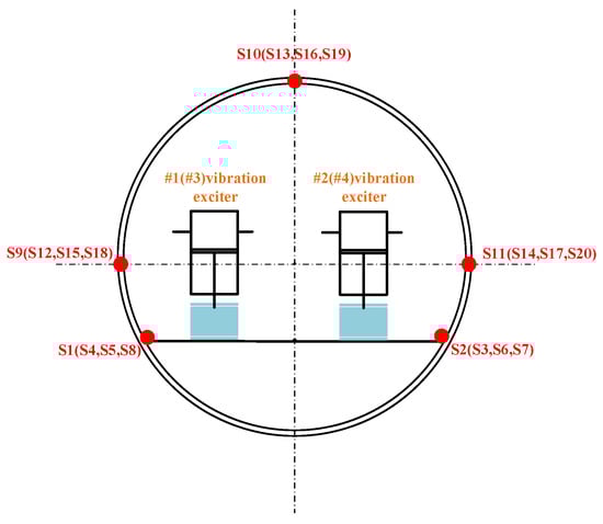 To evaluate the performance of the proposed model, a vibration-acoustic measurement experiment was conducted on a self-built scaled model in Qiandao Lake, Hangzhou. As shown in Figure 8, the model has a three-segment structure (forward spherical shell, mid-section stiffened cylindrical shell, aft conical shell) with key dimensions: overall length 6.4 m, diameter 0.7 m, and ring stiffener spacing 0.9 m. Vibration exciters (#1–#4) were installed on two bases (bow: #1–#2; stern: #3–#4). Acceleration sensors (S1–S8) were placed at four corners of the two bases. Four groups of acceleration sensors (3 sensors per group, S9–S20) were uniformly arranged on the inner wall of the cylindrical shell. For each group, one sensor was at the top of the model, and the other two were at the midpoints of the port and starboard sides, with an interval of 1.5 m between adjacent groups. Detailed layouts are shown in Figure 8 and Figure 9. The layout of the base and vibration exciters at the test site is shown in the Figure 10. An 8-element vertical hydrophone array was deployed 10 m away from the midship section of the model, with the hydrophones positioned at depths of 2 m, 4 m, 5 m, 6 m, 8 m, 10 m, 12 m, and 14 m below the water surface.