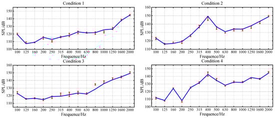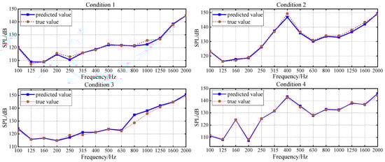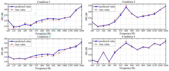 However, the prediction result for Condition 3 at 800 Hz shows significant deviation. This suggests that the actual vibration-noise transmission characteristics under Condition 3 differ from the mapping relationships learned by the model. Meanwhile, the training samples fail to fully characterize the vibro-acoustic transfer function of this frequency band under such operating conditions, which ultimately results in the model’s inability to accurately predict the actual noise level of Condition 3 in this frequency band.