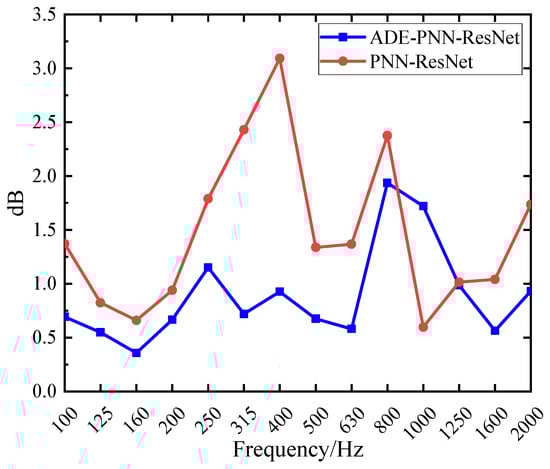 Compared with the results in Section 4.2.1, the integration of the ADE feature selection module has led to a significant reduction in both the MAE and RMSE across all four validation conditions. As shown in Figure 16a, both metrics are now consistently below 2 dB. Figure 17 presents a comparison of prediction errors before and after the integration of the ADE feature selection module. The PNN-ResNet model exhibited relatively large prediction errors at the 315 Hz, 400 Hz, and 800 Hz frequency bands. After introducing the ADE, the errors at the first two frequency bands were significantly reduced: the MAE at 315 Hz decreased from 2.43 dB to 0.72 dB, and that at 400 Hz dropped from 3.09 dB to 0.93 dB. This demonstrates that feature selection provides the model with higher-quality input, substantially lowering prediction errors and enhancing its generalization capability.