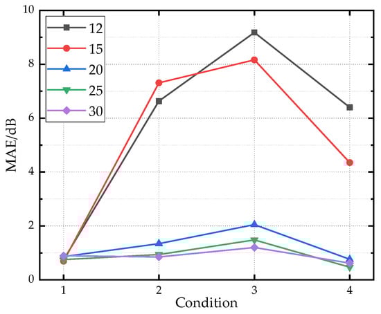 To validate the impact of training sample size on prediction results, random subsets of 12, 15, 20, and 25 samples are selected from the original set of 30 training samples while keeping the validation dataset unchanged. Figure 20 presents line plots of prediction errors for each condition under different training sample sizes. The model performance with 25 samples is similar to that with 30 samples, indicating that the training dataset at this scale is already sufficiently comprehensive to support model learning. When the number of training samples was reduced from 30 to 15 and 12, significant differences in prediction performance are observed across validation conditions. The prediction performance of Condition 1 remains nearly unaffected by the decrease in training sample number, while that of Conditions 2, 3, and 4 drops sharply. The core reason for this phenomenon is that the training dataset still retains the vibration characteristics corresponding to the operating states under Condition 1, whereas those associated with Conditions 2, 3 and 4 are insufficiently represented, directly impairing the model’s generalization ability. Increasing the sample size improves prediction accuracy primarily by better covering a wider range of operating conditions, which allows the neural network to learn the underlying patterns of vibration-to-noise transmission more effectively.