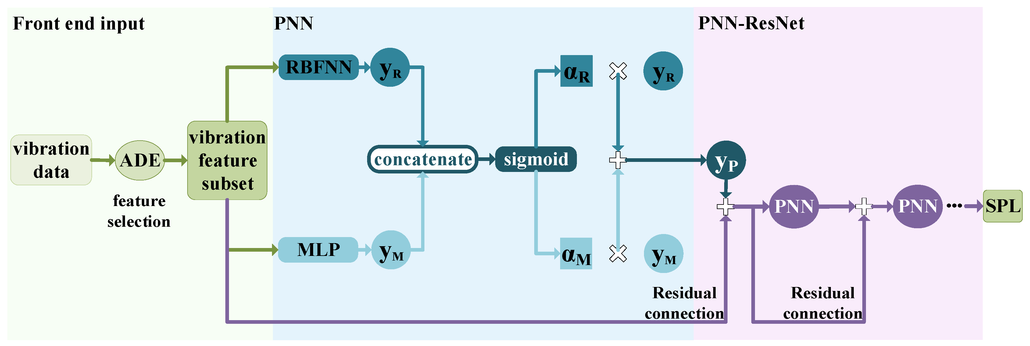 PNN-ResNet combining RBFNN and MLP in parallel is proposed to model the transfer function between underwater vehicle vibration and radiated noise. The RBFNN captures local nonlinear correlations, while the MLP extracts global complex patterns through feature abstraction. These two networks form a parallel module PNN, which is then stacked in series via residual connections. This design not only enhances the modeling of deep nonlinear mapping relationships but also avoids gradient vanishing, realizing the collaborative complementarity of local and global features.