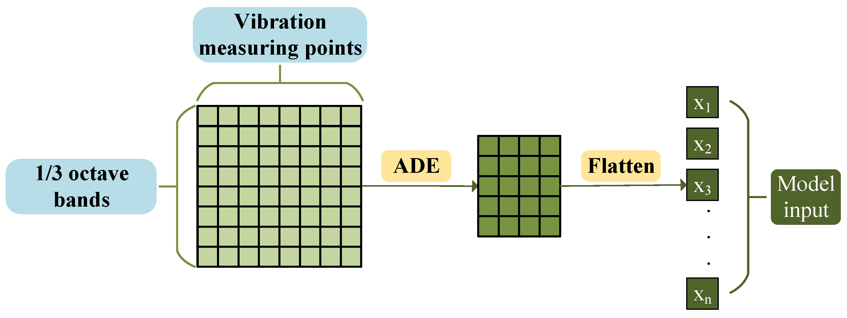 Based on the aforementioned advantages, this paper uses Adaptive Differential Evolution (ADE) to select the vibration feature subset with strong correlation to the target frequency band noise, and the fitness value is defined as the prediction error during neural network training. The specific process is illustrated in Figure 2: each row of the original input data represents the acceleration level of each structural vibration measurement point under a specific frequency band. The ADE algorithm implements a two-dimensional screening of vibration measurement points and 1/3 octave bands, and the resulting highly correlated features are flattened into a single row as the fully connected input for the subsequent neural network.