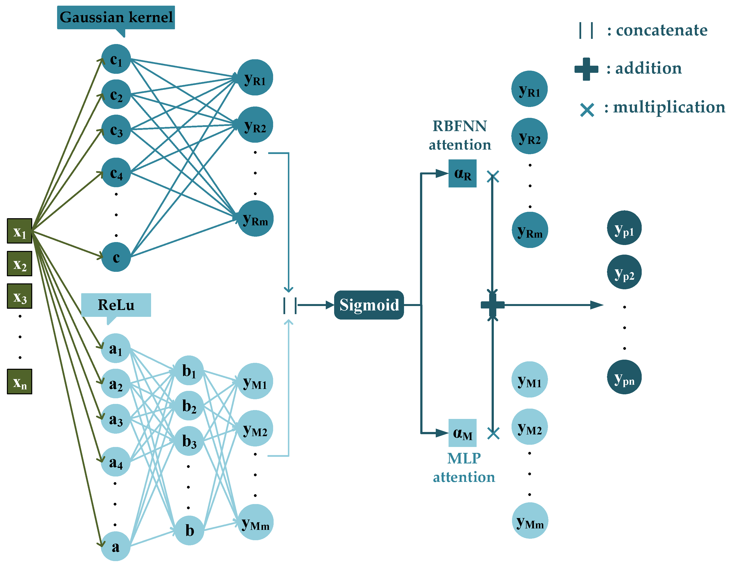 The selected features are fed into the neural network model and fully connected to the hidden layer. The RBFNN maps input data to a high-dimensional space and extracts nonlinear features via multi-scale Gaussian kernels to simultaneously capture local features at different levels. The MLP learns global feature correlations through a multi-layer fully connected network, forming feature complementarity with the RBFNN pathway. The sigmoid function is used to dynamically adjust the output weights of the RBF and MLP pathways, enhancing key features and suppressing noise. The specific architecture of PNN is shown in Figure 4.