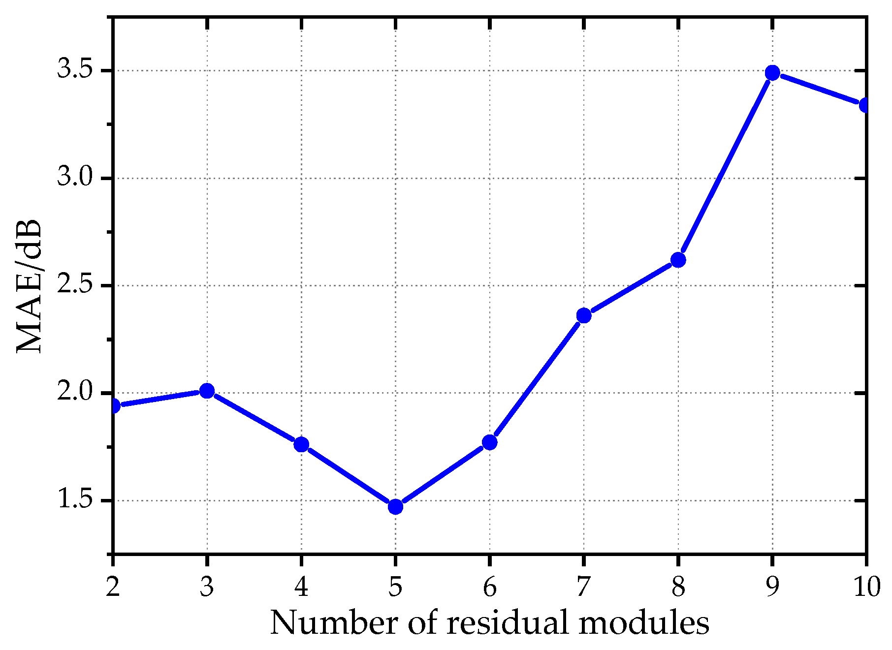 Figure 14. The trend of validation dataset MAE changing with the number of residual modules.