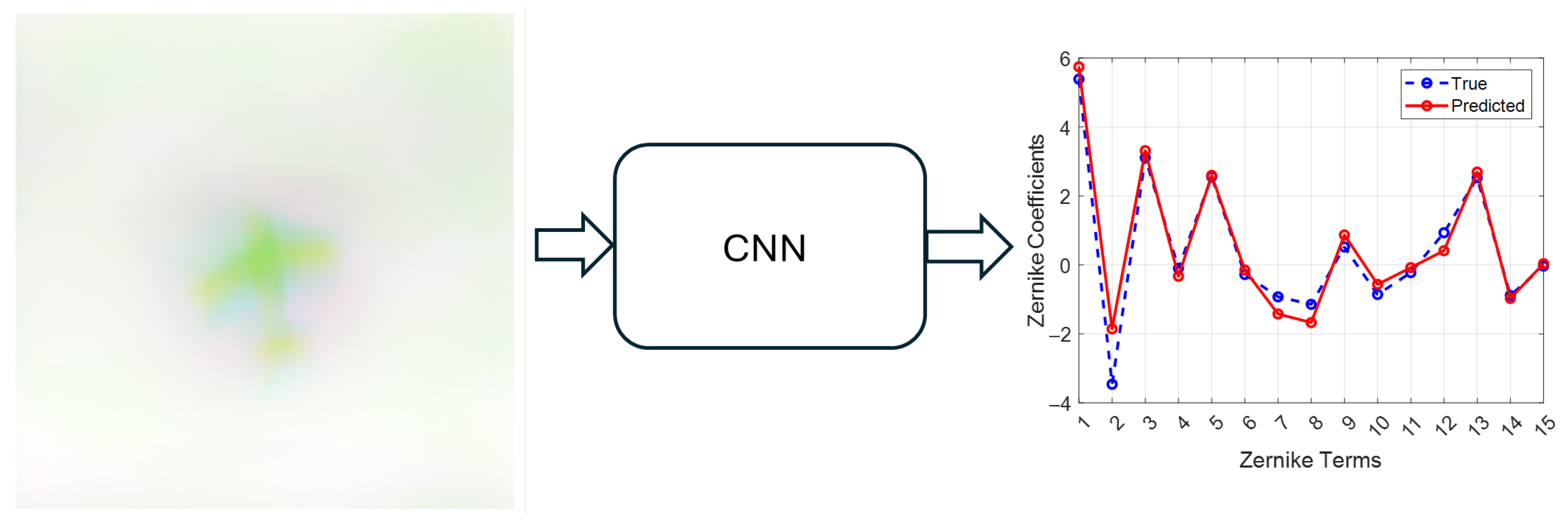 • Image formation and RGB stacking. Each PSF was convolved with the clean image to produce aberrated versions corresponding to different defocus states. These three images were stacked into the RGB channels, providing the network with multi-plane information that improves prediction accuracy compared to single-plane inputs. Each supervised training sample therefore consists of the RGB stack of defocused images together with the 15 Zernike coefficients ( a 4 ,   ,   a 18 ) .
