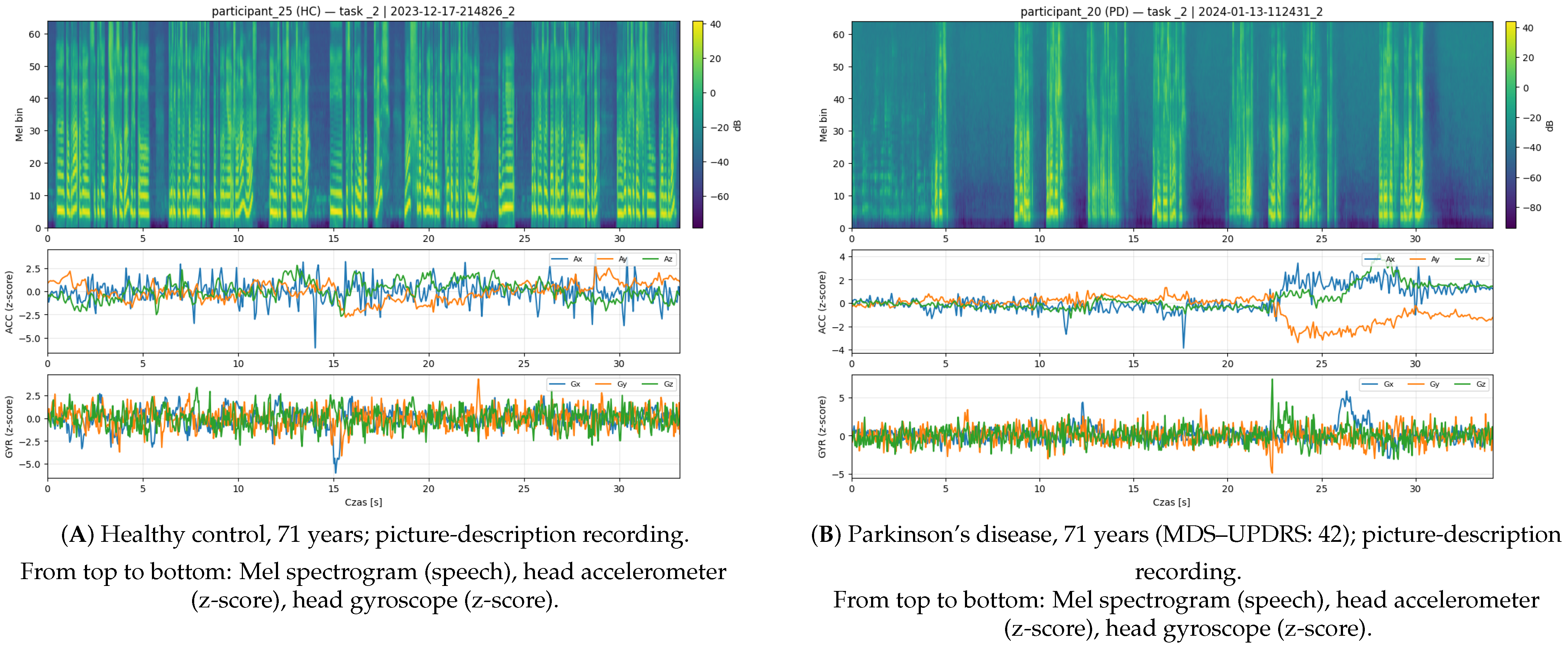 7]. At the same time, inertial measurement units (IMUs) placed on the trunk, limbs, or head capture kinematic signatures of gait, posture, tremor, and balance that are central to PD pathophysiology but often underrepresented in purely audio-based pipelines [