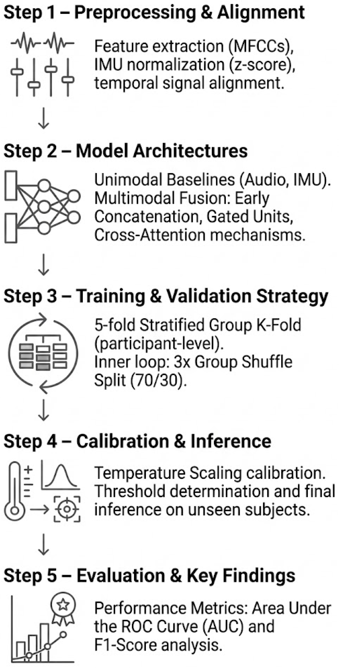gated_early); (4) train and evaluate these models under stratified, subject-aware cross-validation with probability calibration; and (5) compare pooled and task-wise performance, focusing on whether fusion yields a consistent gain over audio-only baselines, particularly in movement-engaging tasks.