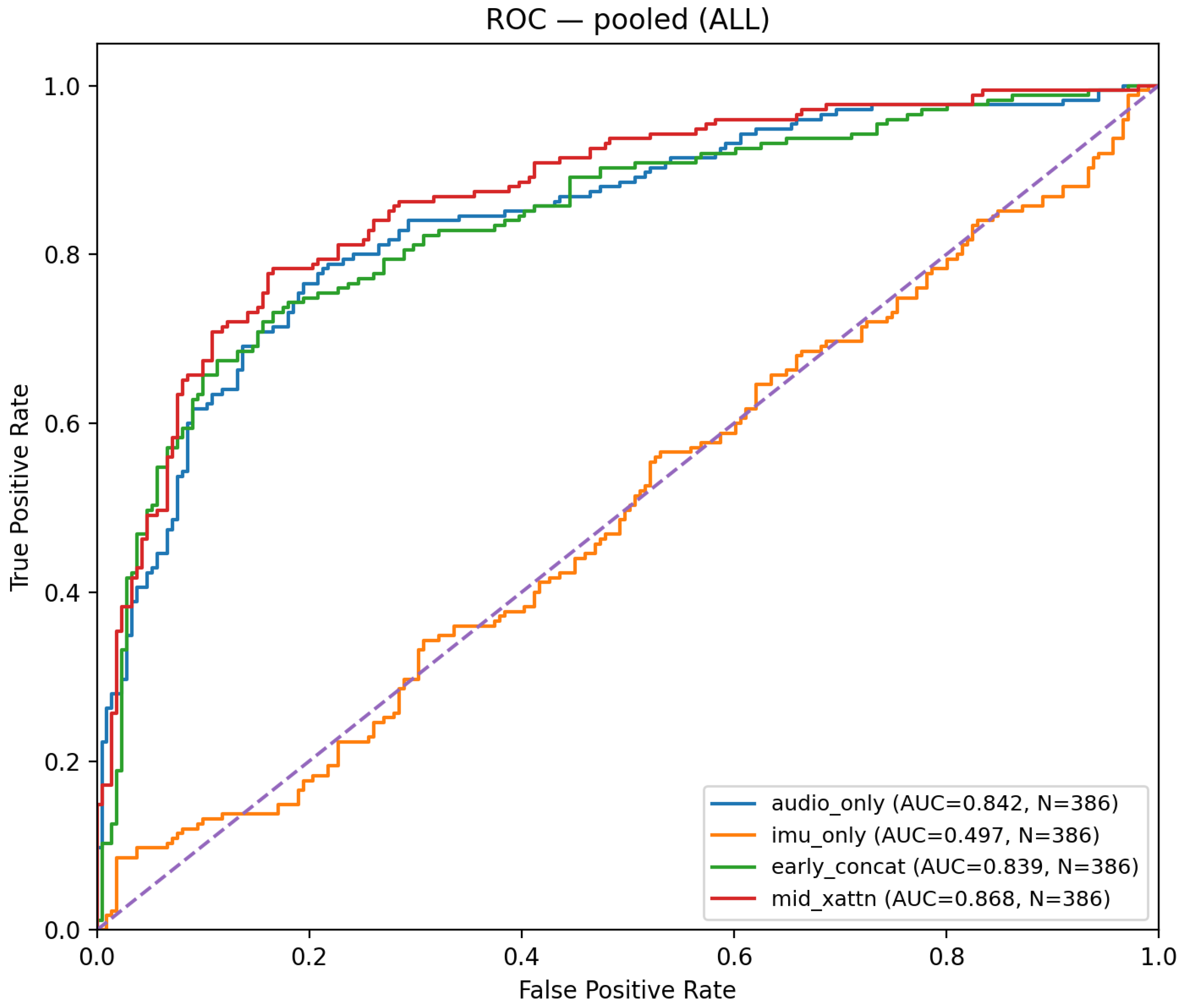 audio_only) and also the best pooled Accuracy (≈0.806;