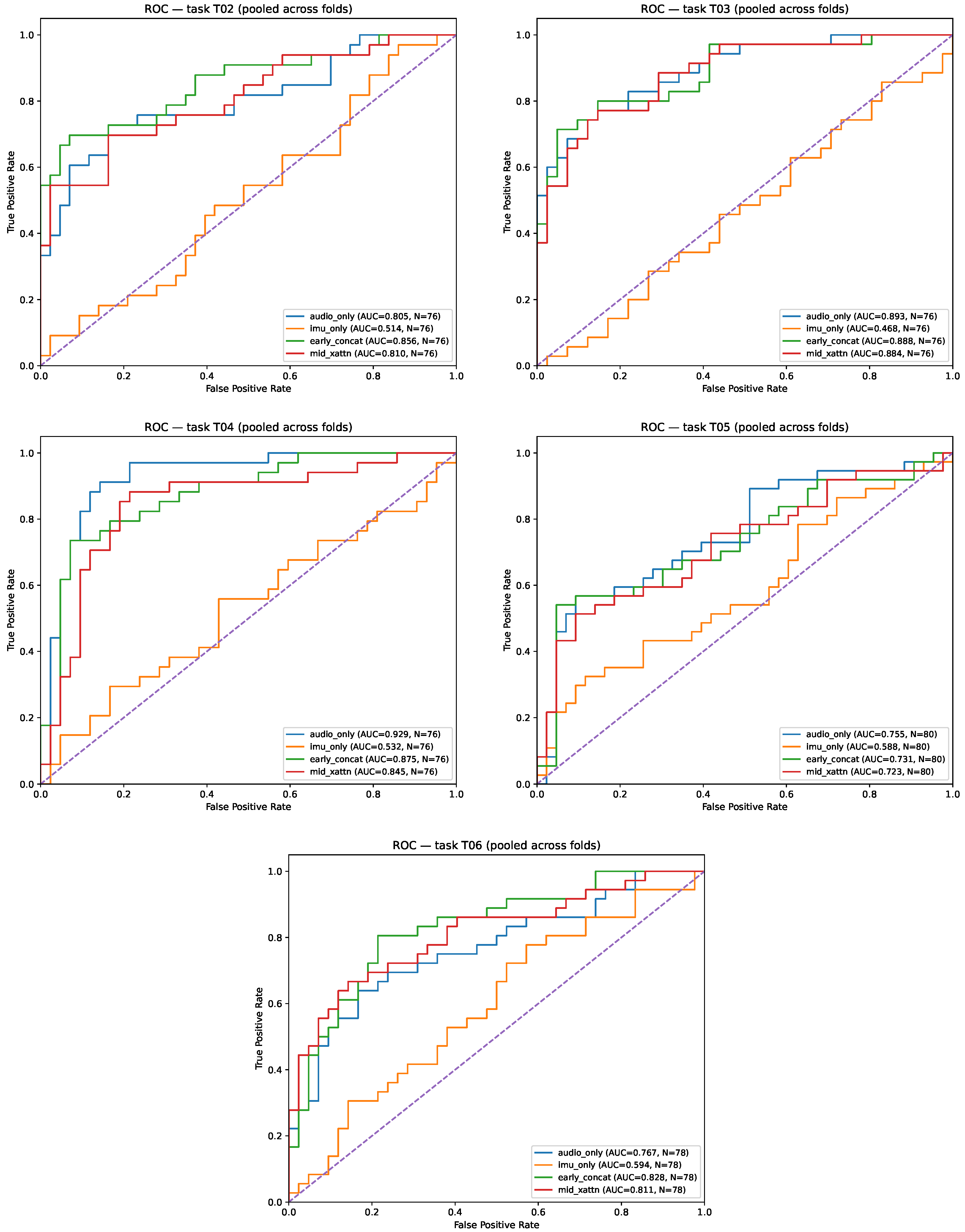 gated_early on T03 and T06 indicates that learning when and how much to trust IMU, rather than always concatenating, can improve separability while maintaining stable temporal modeling. More broadly, we observe a consistent hierarchy: (a) IMU-only remains insufficient across tasks (low AUC and unstable threshold-dependent behavior), (b) audio-only provides a strong baseline and dominates tasks with predominantly acoustic cues (T04, T05), and (c) fusion offers the largest benefits in tasks where head-motion context disambiguates speech production patterns (T03 and, in ranking terms, T06). This supports the interpretation of IMU as a context signal that regularizes or re-weights acoustic evidence, rather than an independent discriminator.