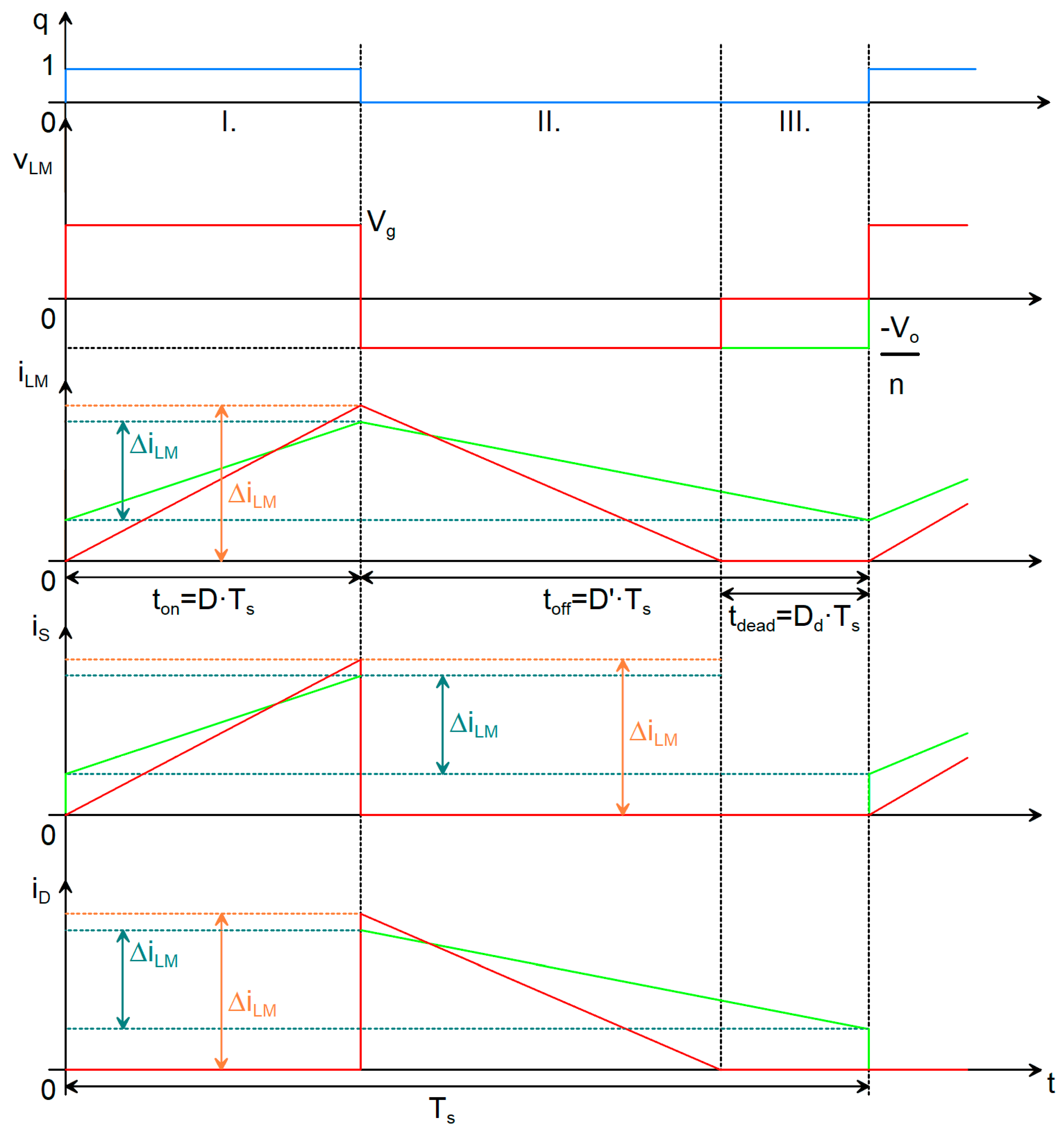 Also, we may calculate the current through the capacitor IC and the voltage across the inductor VLM in all three topological states [12,13]. In topological state I (tON):