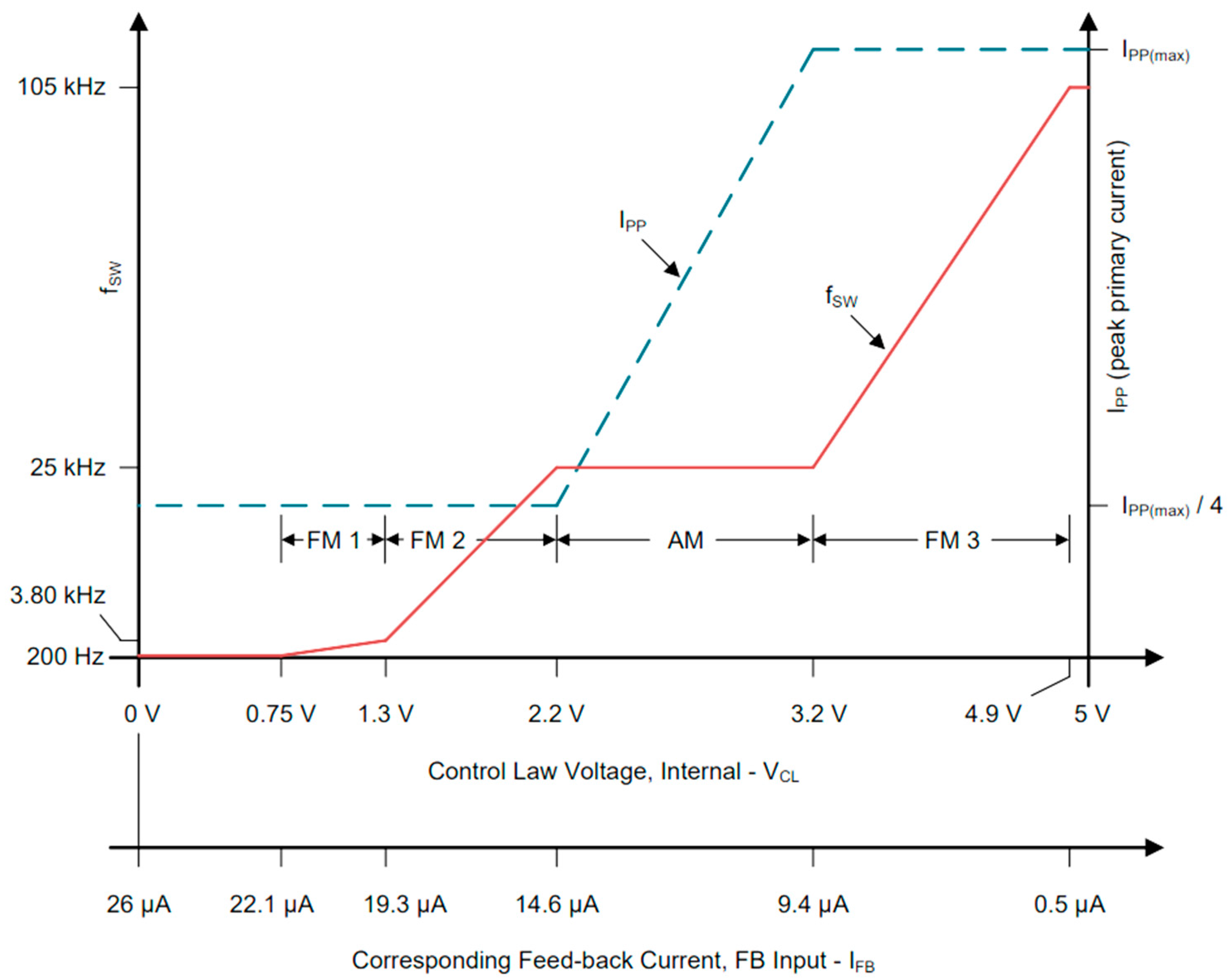 Under these conditions, the converter operates in DCM, such that the diode does not conduct over the entire tOFF interval. The corresponding waveforms for this operating mode are shown in red in Figure 3.