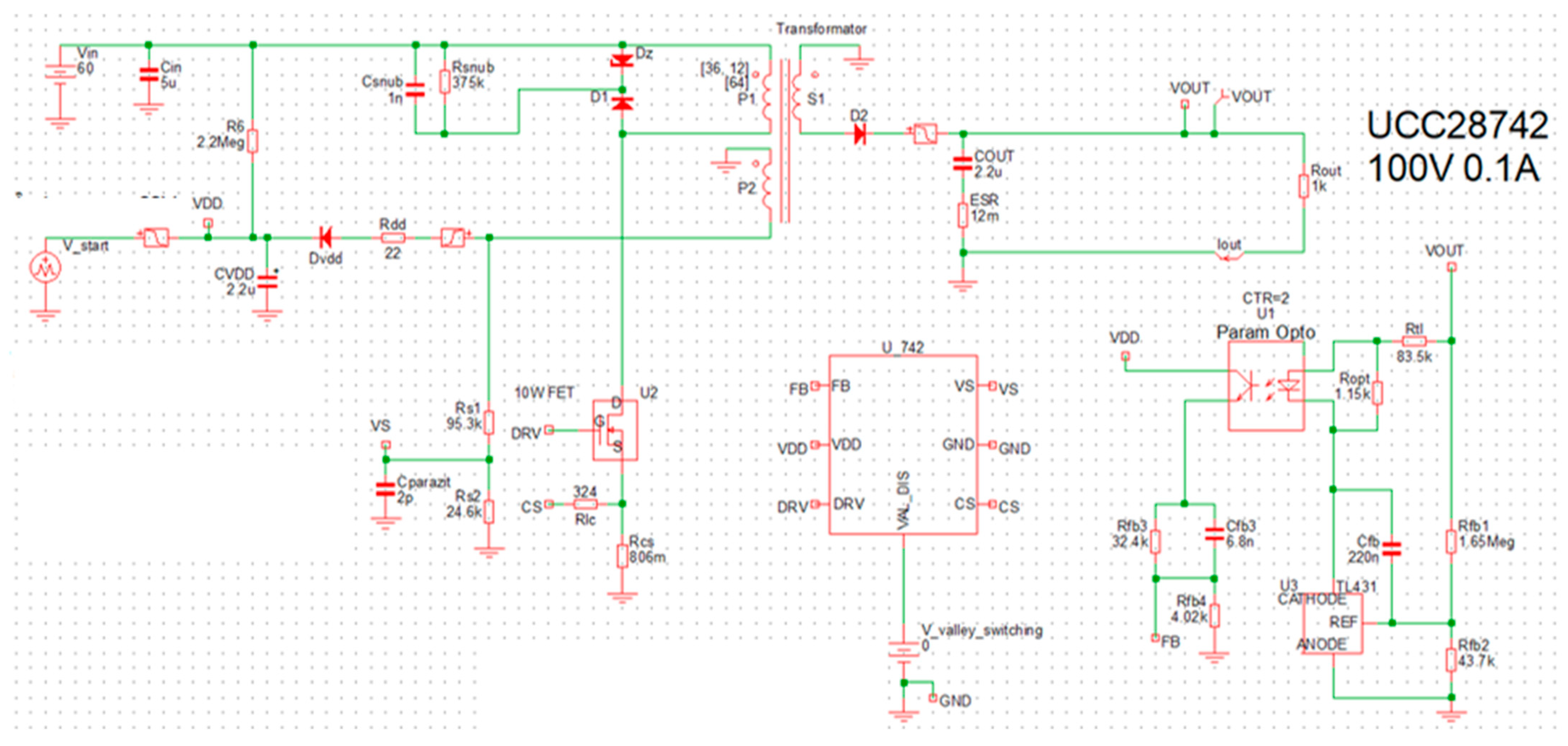 23. Texas Instruments Inc. UCC28742 High-Efficiency Flyback Controller with Optocoupler Feedback; TI Inc.: Dallas, TX, USA, 2018. [Google Scholar]