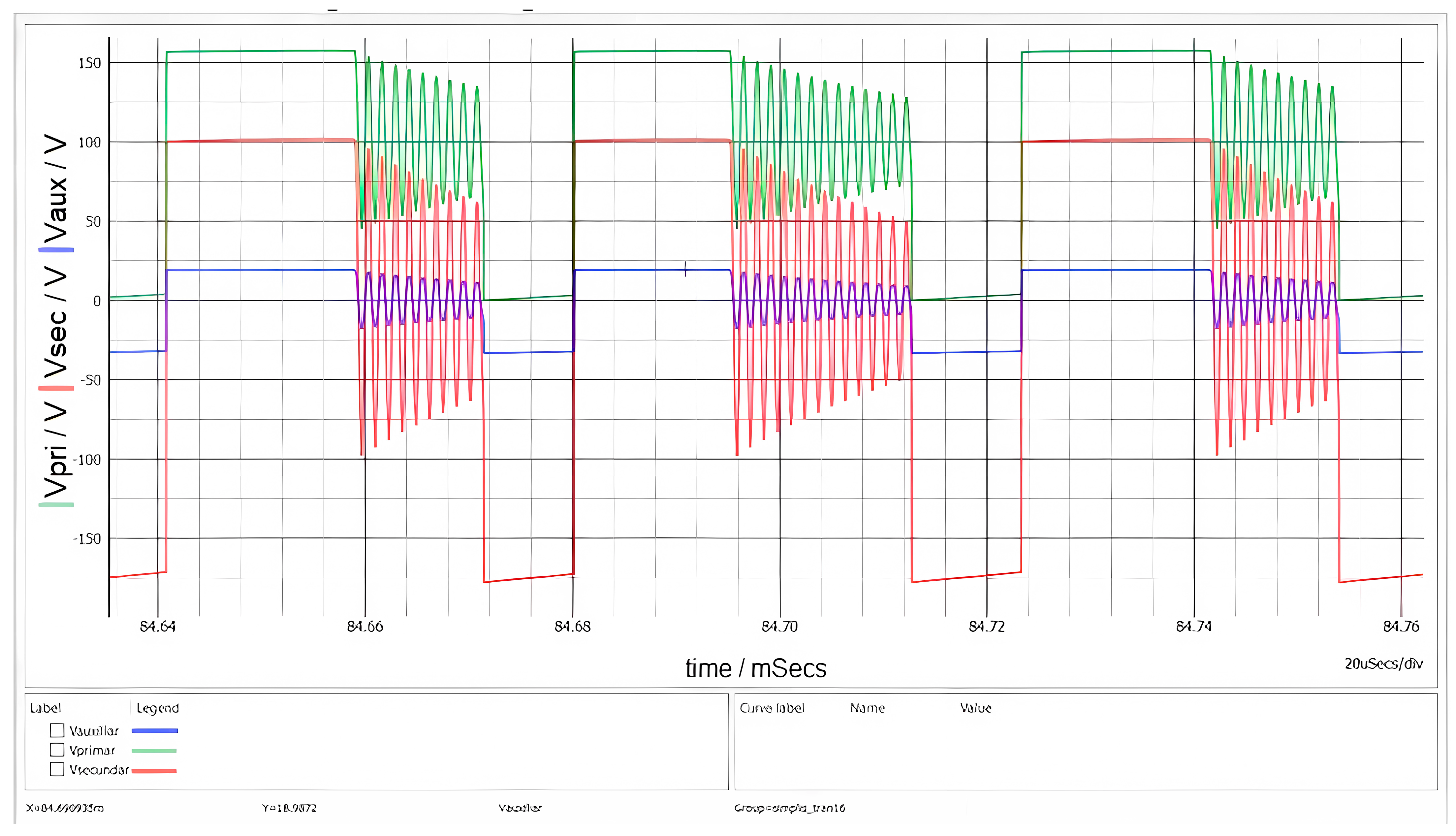 Figure 11. Waveforms of the primary (green), secondary (red), and auxiliary (blue) voltages when Vg = 100 V.