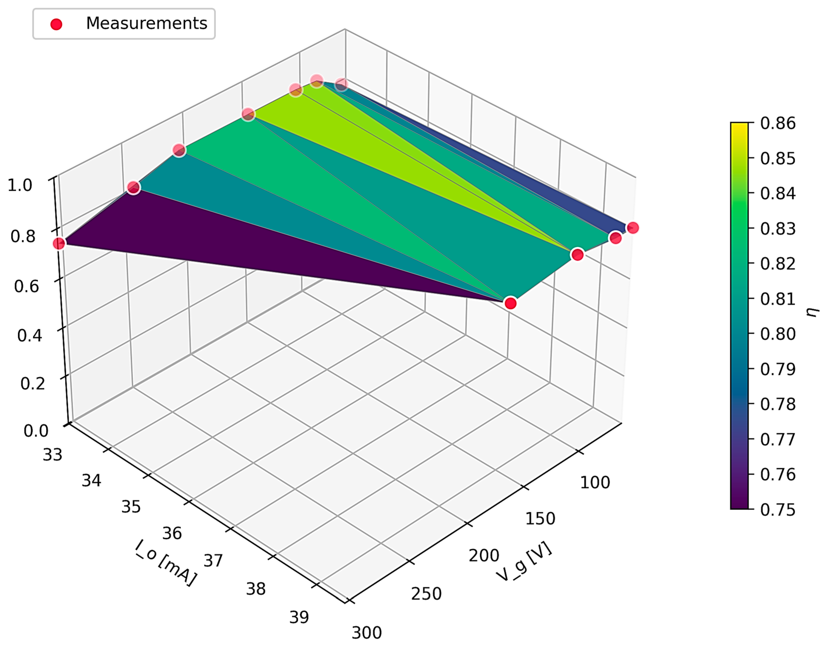 Testing was conducted using an Elektro-Automatik (Viersen, Germany) EA-PSB 11500-60 high-voltage programmable power supply and a Tektronix (Beaverton, OR, USA) MDO3104 mixed-domain oscilloscope equipped with a 10× high-voltage probe. The converter was characterized over a range of input voltages and load conditions, and the LED beacon served as an indicator to verify the stability of the output.