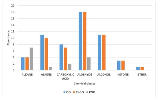 The analysis of the volatile profile of the three oils under investigation (EVOO, OO, POO), performed using gas chromatography–mass spectrometry (GC-MS) coupled with solid-phase microextraction (SPME), enabled the identification of 60 compounds. These were classified into seven main chemical groups: alkanes, alkenes, carboxylic acids, aldehydes, alcohols, ketones, and others (Table 3).