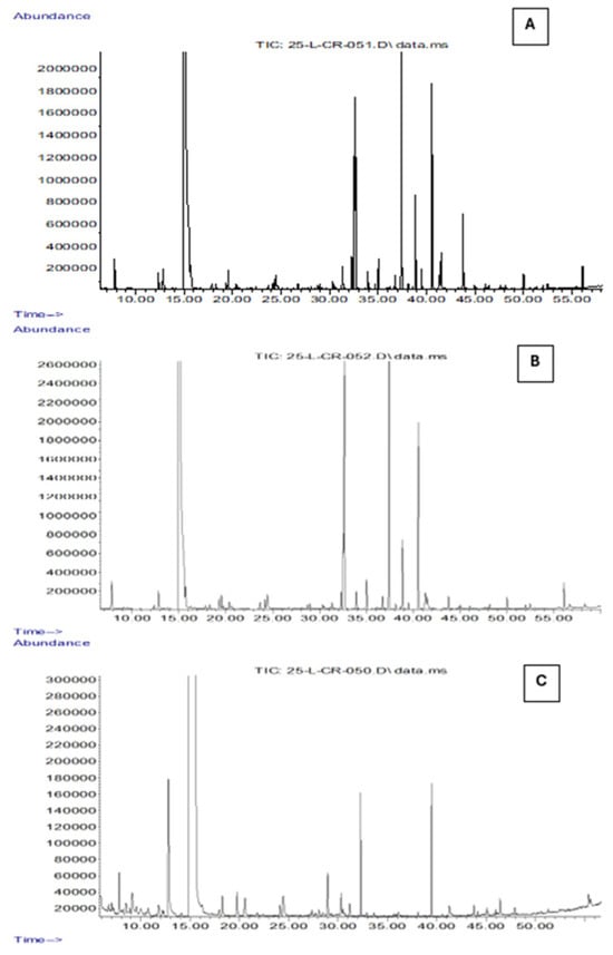Total ion chromatograms (TICs) obtained by GC-MS analysis coupled with SPME of OO (A), EVOO (B), and POO (C) samples. The x-axis represents the retention time (min), while the y-axis indicates the relative abundance of the detected volatile compounds.