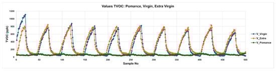 Figure 7 displays the temporal evolution of total volatile organic compounds (TVOCs) for three pure olive oil categories: extra virgin (V_Extra), virgin (V_Virgin), and pomace (V_pomace). The plotted curves represent the TVOC response over time during alternating adsorption and desorption phases. Extra virgin and virgin oils exhibit distinct and reproducible peak patterns, characterized by sharp rises during the adsorption phases followed by gradual descents in the desorption phases. Notably, extra virgin oil consistently produces the highest TVOC amplitudes, while virgin oil follows a slightly lower profile. In contrast, olive pomace oil shows a markedly flattened response, with minimal peak formation and subdued VOC release. This behavior reflects the reduced content of aroma-active volatiles in lower-quality oils, consistent with their known sensory degradation.
