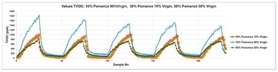 Figure 8 extends the analysis to blended samples created by mixing virgin olive oil with 10%, 30%, and 50% olive pomace oil. The cyclic TVOC patterns reveal a clear gradient in signal amplitude and dynamics associated with the degree of adulteration. The 10% blend (blue curve) maintains a peak structure similar to that of pure virgin oil but with slightly diminished intensities. As pomace content increases to 30% (orange curve) and 50% (green curve), the peaks become broader and less pronounced, indicating significant disruption of the volatile profile. These shifts in amplitude and temporal shape confirm the system’s sensitivity to adulteration, even at low levels, and highlight the diagnostic potential of MOX sensor arrays for real-time detection of olive oil authenticity.