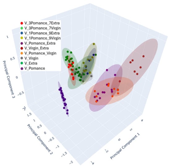 Together, both PCA plots (Figure 8 and Figure 9) illustrate the strong discriminative power of the MOX-based electronic nose in differentiating olive oil categories. The high variance explained by the first component in both the 2D and 3D analyses demonstrates the consistency and reliability of the sensor responses in capturing the key features that distinguish pomace, virgin, and extra virgin oils.