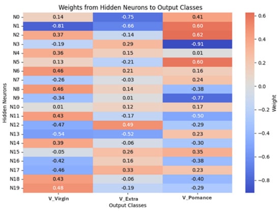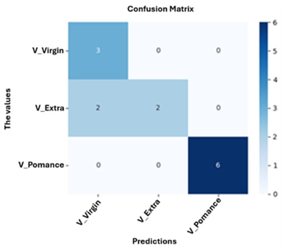 Figure 13 shows the confusion matrix obtained for the neuronal network model trained to classify olive oils into three categories: pomace, virgin, and extra virgin. The model achieved an overall accuracy of 84.62%, with perfect classification of olive pomace oil, partial misclassification of extra virgin oils as virgin, and correct classification of virgin samples. These results suggest that while the model robustly identifies olive pomace oil, the classification between extra virgin and virgin oils is more challenging due to their compositional similarity.