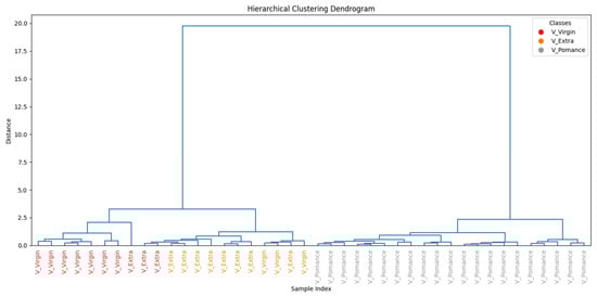 The use of Principal Component Analysis (PCA) proved to be a particularly effective approach for exploring and visualizing the discriminative capability of the electronic nose based on MOX sensors in recognizing different types of oil and their mixtures. Initially, all available sensor outputs were considered; however, channels that added noise or did not improve discrimination/model performance were excluded from the final feature set to avoid unnecessary dimensionality. The plot shown (Figure 9) displays the projection of the data obtained from the electronic nose responses along the first principal components, which account for most of the variability within the dataset. This MOX sensor-based analysis was applied to samples of extra virgin olive oil, olive pomace oil, and virgin olive oil, with the aim of highlighting potential differences in the volatile compound profiles among the various oil types.