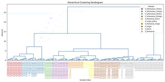 The analysis reveals a well-defined separation between pure oils (extra virgin, virgin, and pomace) and their respective mixtures. The distribution of the samples in the PC1-PC2 plane reflects a gradient in volatile profile composition according to blend ratios. Notably, Principal Component 1 (PC1) explains 82.04% of the total variance, while PC2 accounts for 16.15%, providing a comprehensive representation of the variability within the dataset. The pure extra virgin olive oil samples (green) appear tightly grouped and are clearly distinct from both pomace (purple) and virgin oils (gray).