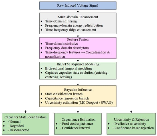 To address these limitations, this paper proposes a Bayesian deep learning framework capable of automatic capacitor state recognition and capacitance estimation while explicitly modeling predictive uncertainty. The framework first performs multi-domain signal enhancement—including operations in the time, frequency, and TF domains—to attenuate noise and strengthen capacitor-related signatures. A BiLSTM network is then employed for sequence modeling, followed by Bayesian classification and regression modules that generate predictive distributions and associated confidence intervals. Uncertainty estimation is further refined through MC Dropout and SWAG, and a rejection mechanism is incorporated to enhance diagnostic reliability in safety-critical environments.