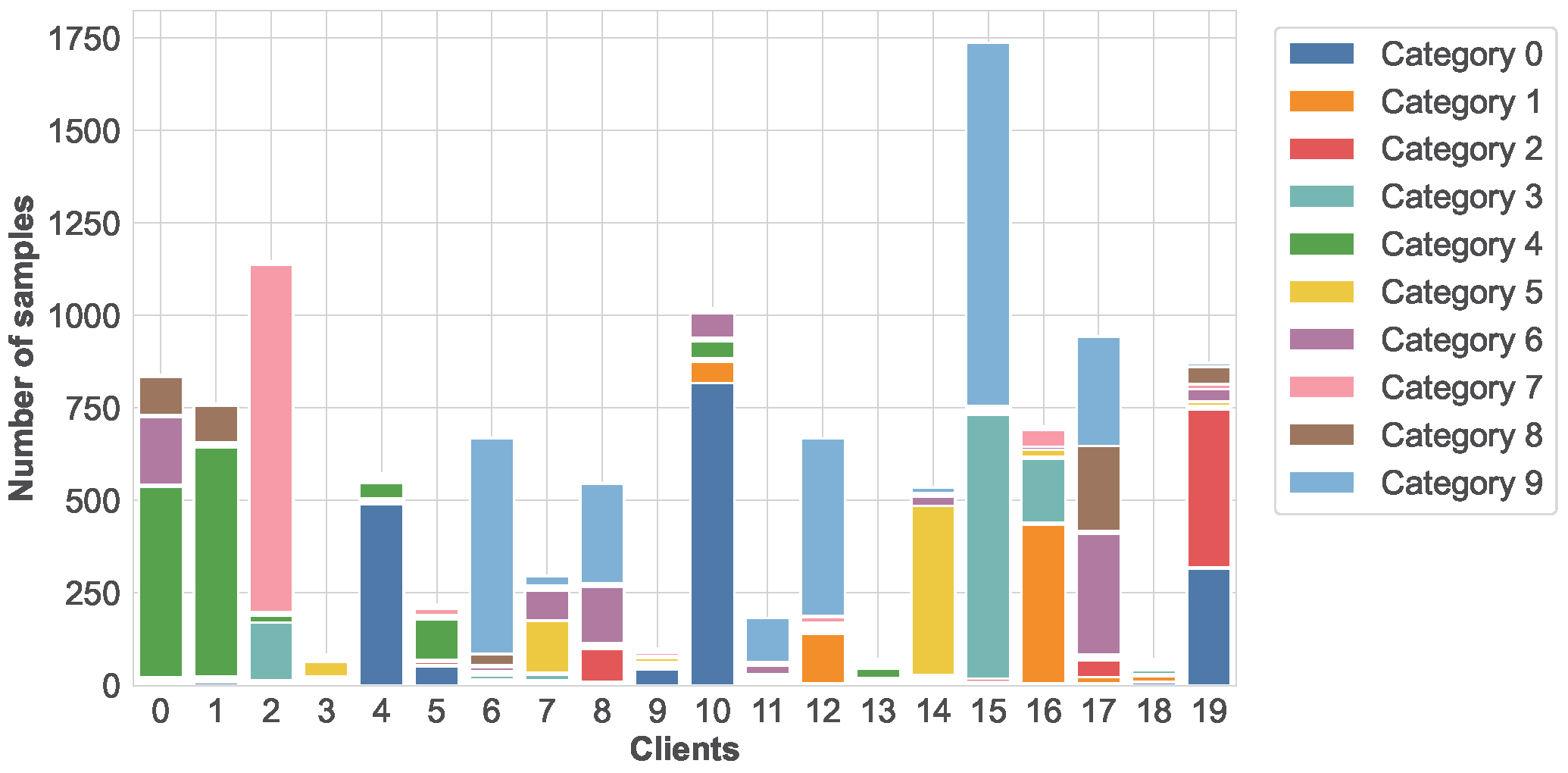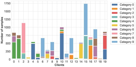 leads to a higher degree of Non-IID heterogeneity. Unlike modeling methods that only focus on class imbalance or data volume imbalance, the Dirichlet distribution can jointly model class distribution skewness and data volume heterogeneity within a unified probabilistic framework. This data partitioning method more accurately reflects the multidimensional complexity of data distribution in real-world environments, and is particularly well-suited to the highly heterogeneous and distributed nature of terminal device data in IoT environments. Under this setting, each client receives a skewed label distribution, resulting in substantial variability in both label diversity and sample volume across clients.